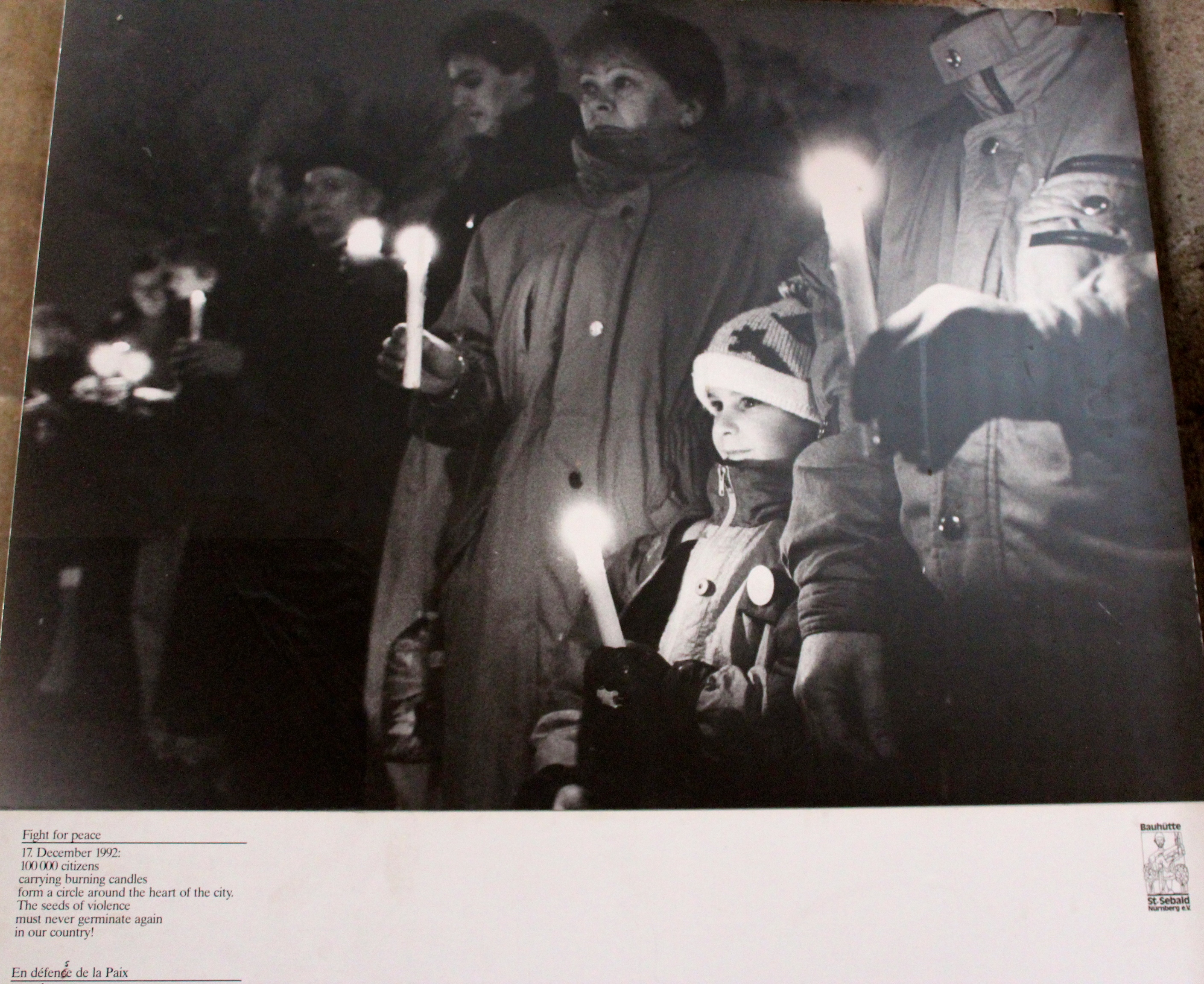The last image is quite moving, showing the people of Nürnberg in 1992 clasping hands and encircling the Medieval heart of the city in a candlelight-vigil vow never to allow the seeds of violence to germinate in their country again.
