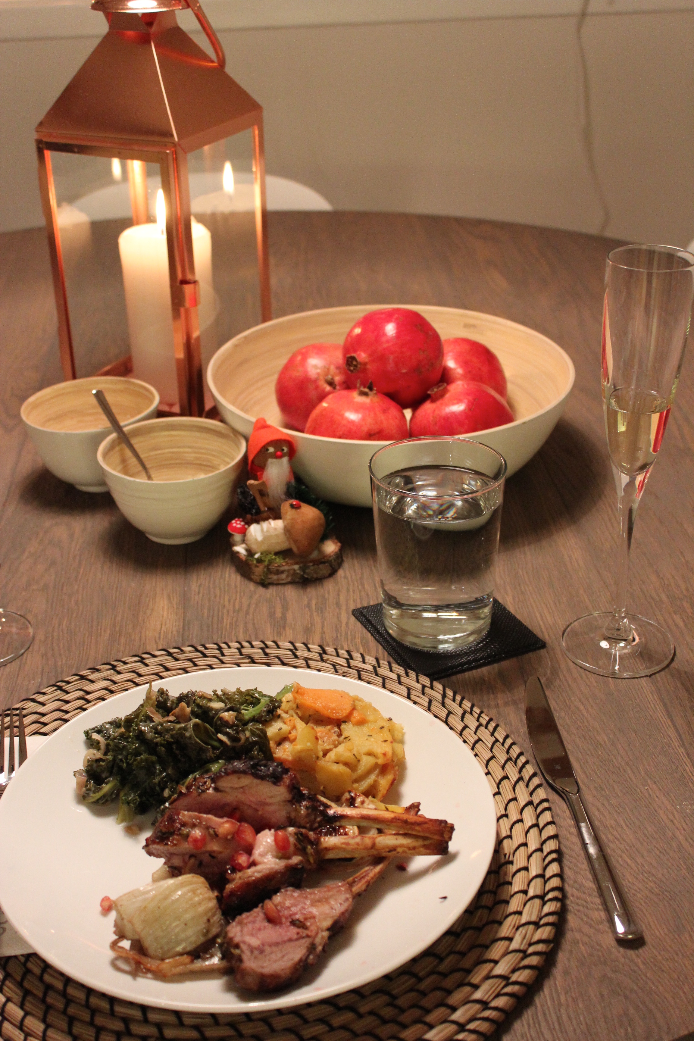 Lamb chops with pomegranate-and-fennel glaze, creamed greens with chestnuts (roasted in our kitchen fireplace), potatoes dauphinois, and lavender crème brûlée for dessert. Nothing like a hearty meal after a day of suicidal sledding.