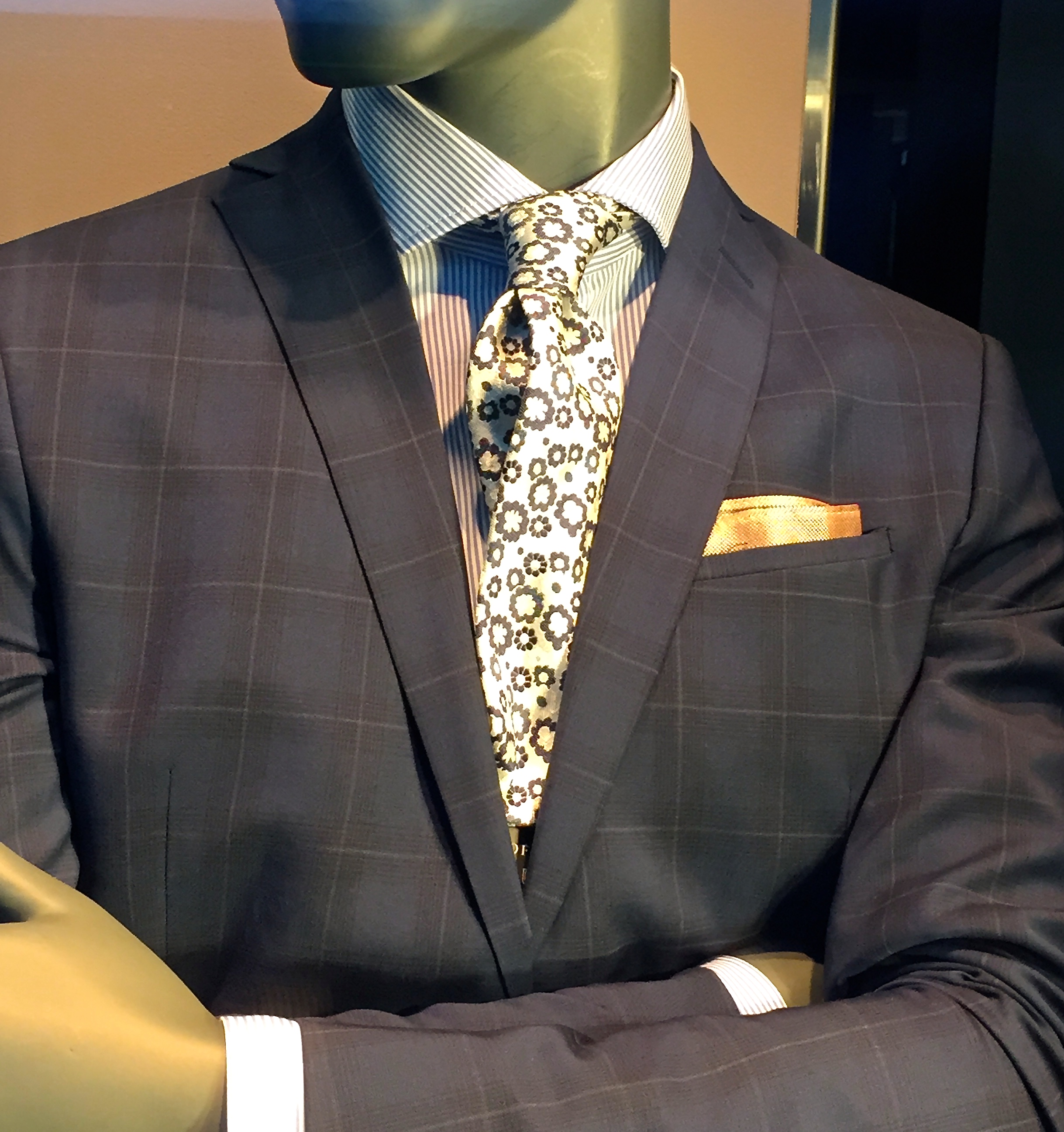 No fear of mixing patterns for men’s suit-shirt-tie combos. Sport coats with pocket squares are super common.