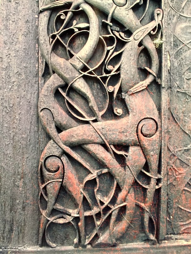 A closeup of the entwined animals (a deer and a serpent?), biting and strangling one another. These are similar to the “grappling beasts” imagery used by Vikings. Christians may have adopted them to symbolize the inherent struggle between good and evil.