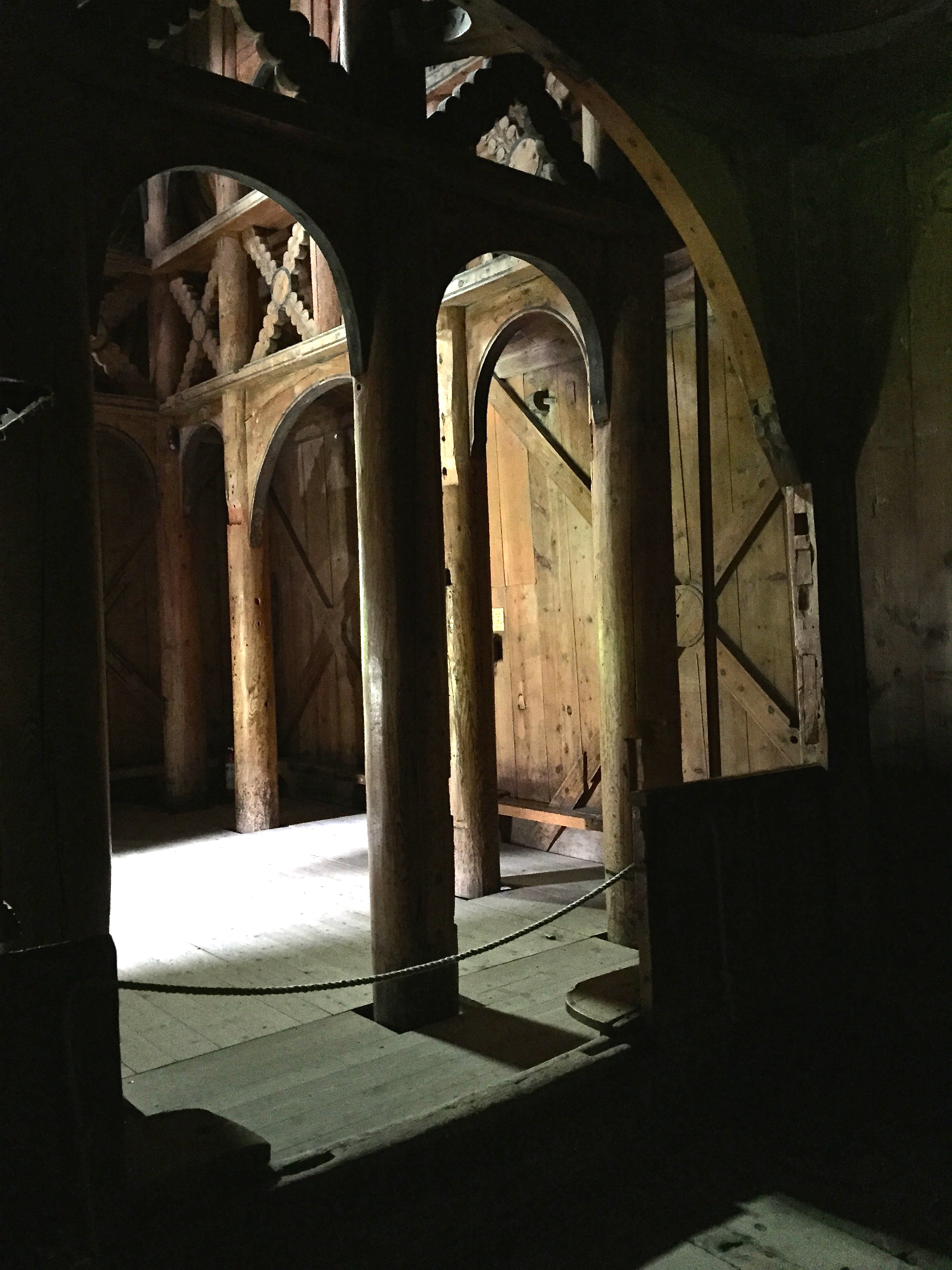 The interior of the church shows the raised central nave and the big pillars (staves) that support the roof and walls. In the background, notice the x-shaped cross-bracing along the stave walls. In Medieval times, everyone stood for the sermon. The benches along the wall were only for the elderly.