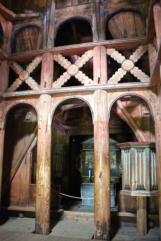 Note the St. Andrew’s crosses above. (The saint was crucified on an X-shaped cross). These create a cathedral-like, open-air clerestory (gallery) above that has round portholes for light and draws the eye upward towards the heavens. The altarpiece is from the 1600s and the pulpit is from the 1500s.