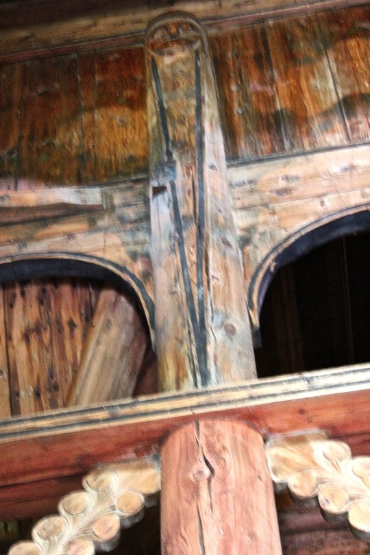 Trees for the church pillars and other parts were selected ten years in advance. All the branches were cut off except those towards the top. The tree then continued to grow like this for ten years, so that the pine sap would permeate the entire tree and make the wood hard. The final step was to slather the wood with tar to make it waterproof.