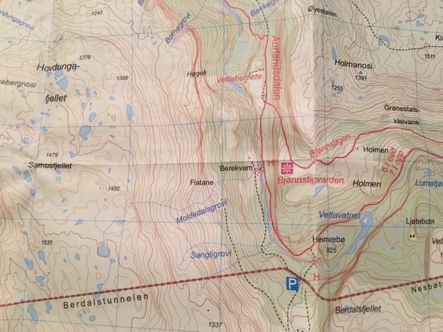 or my “walking south wales” reader — here’s the map I mentioned. In this image, you’d be coming along Route 50 by car from Aurland, which is off the map to the left. So as you can see, going from left to right, you’d go through the Berdalstunnelen (Berdals tunnel) first. Then right before you get to to the Nesbotunnelen (Nesbo tunnel), you’ll see the parking lot. (It’s the big blue P here.) Park there, and cross the road, and you’ll see the trail off to your left. There are actually two trails that cross the road, which appear as dotted lines. I’d take the trail on the right, that goes over the bridge near Heimrebo. The bridge is marked with red brackets on this map, and you’ll physically see it once you walk down the trail a bit — it’s the narrow suspended footbridge in my pictures. (The other trail on the left leads to the Berekvam bridge, which was broken the last time we hiked this, so I wouldn’t go that way.) So if you cross the bridge at Heimrebo, then you’ll follow the really big trail to your left (it’s the big red line that looks like a road), and continue to Vetlahelvete, which is marked in red at the top of this map; it’s perpendicular to the vertical word Aurlandsdalen. Hope this helps! Have fun!