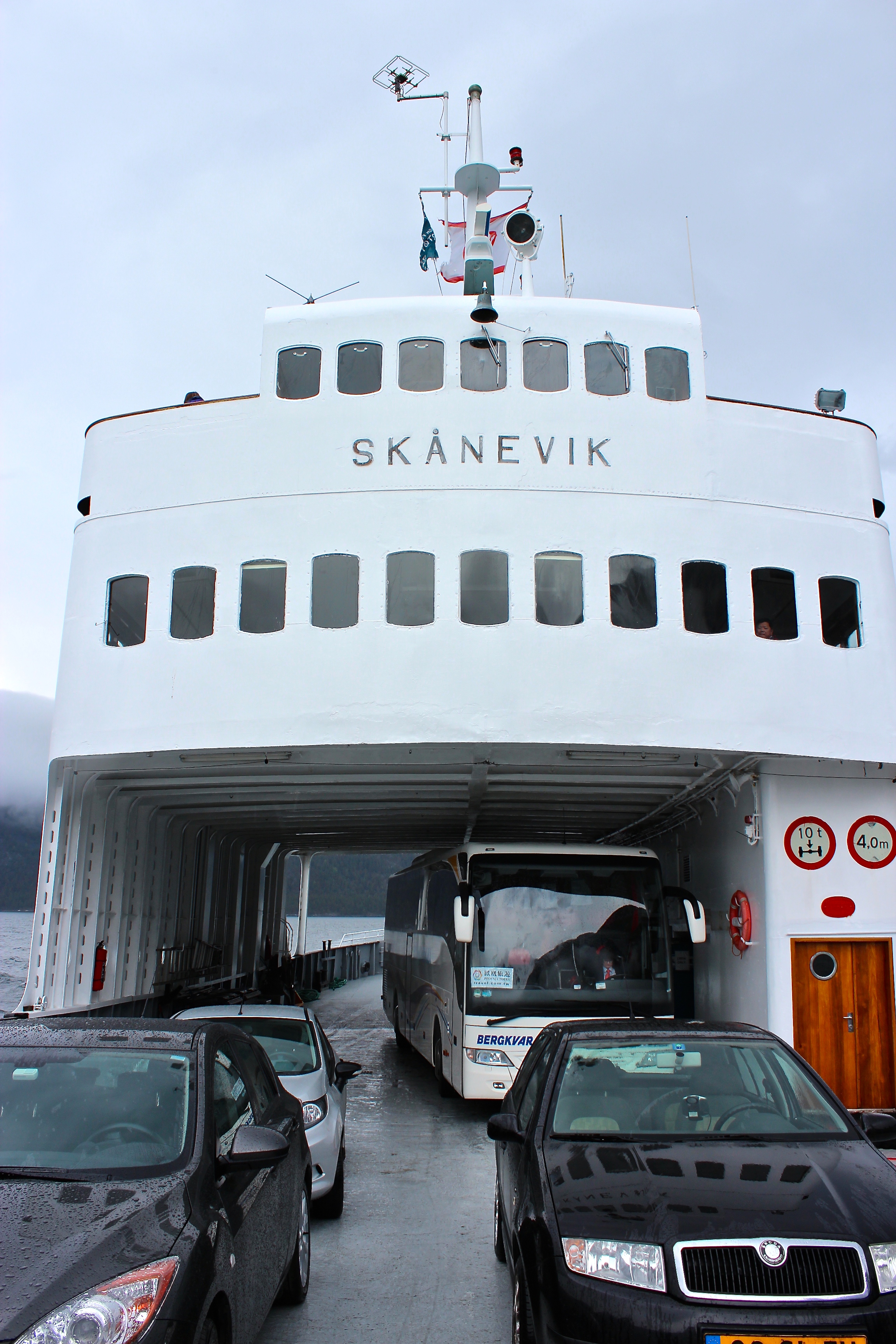 IMG_9944 August 19, 2015 2304 × 3456 Cruising to Bergen Our ferry from Kaupanger to Gudvangen. Note the tour bus, which later had to be reoriented to angle more sharply across the width of the boat in order to balance the load.