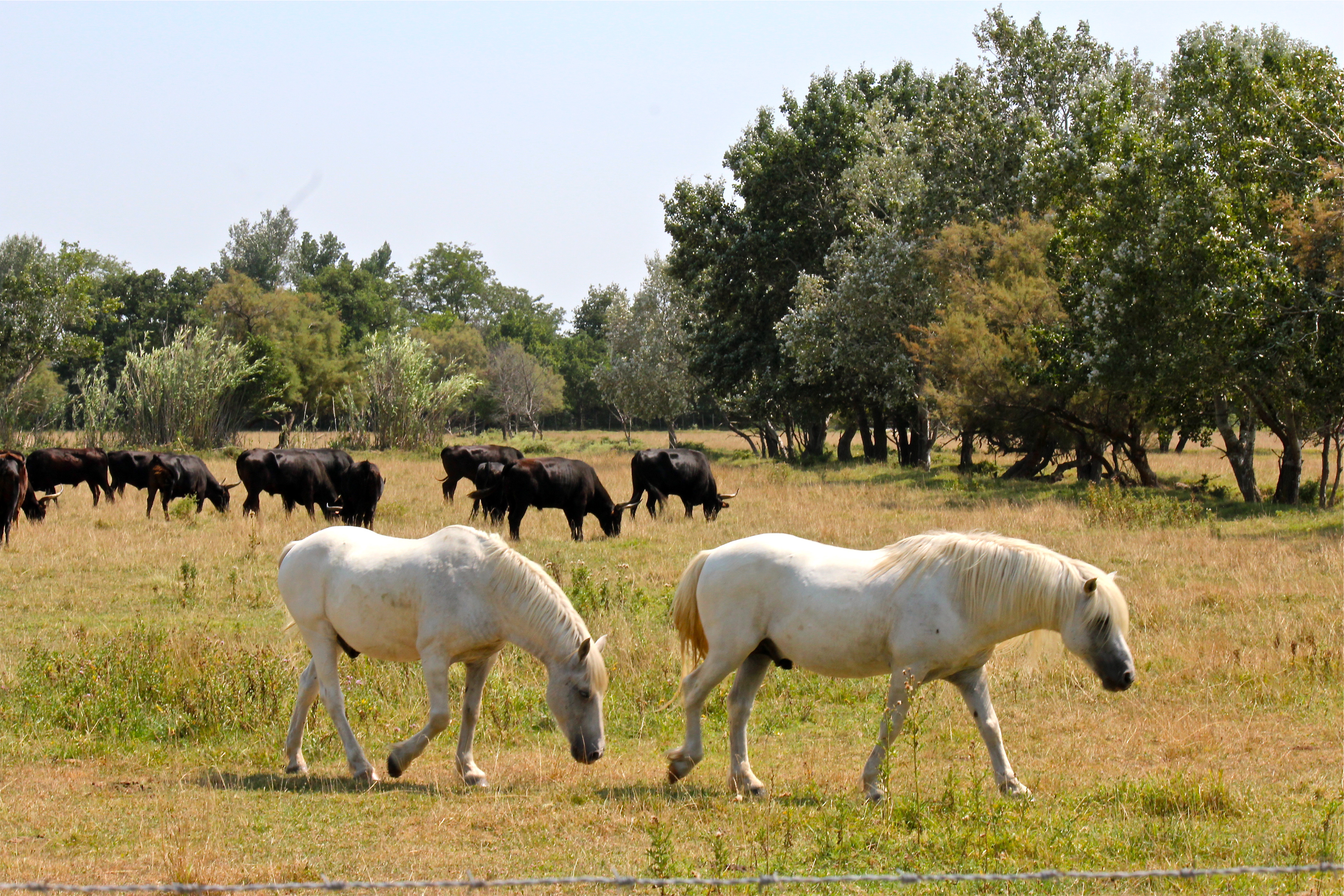 IMG_0226 September 18, 2015 3456 × 2304 Paris and Provence Camarguais horses and bulls are reared together on many ranches in the Camargue. A type of cowboy called a “gardian” rides the white horses to herd the bulls.