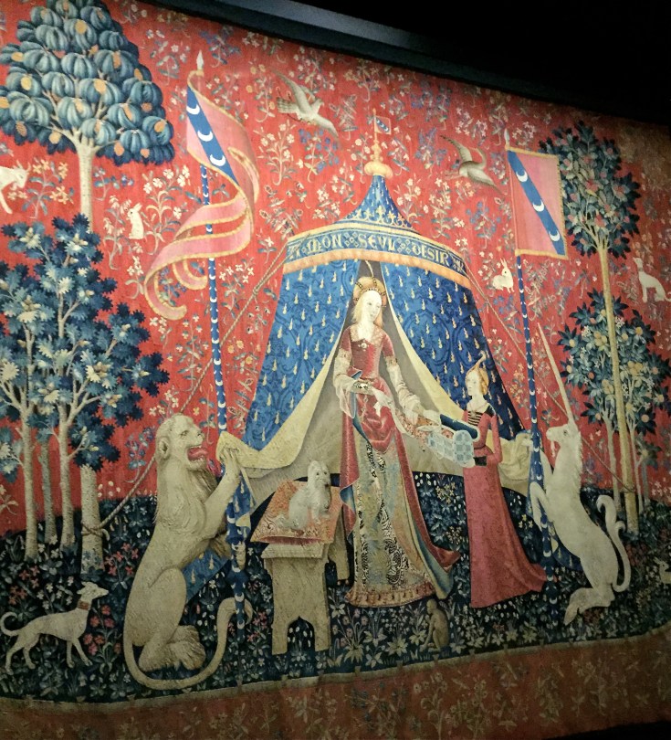 IMG_3821 September 16, 2015 2414 × 2661 Paris and Provence The mysterious sixth panel is entitled “À mon seul désir” (my sole desire). It may mean that the five senses bring greater intellectual understanding, or it may mean that the sixth sense is the heart, which brings spiritual understanding.