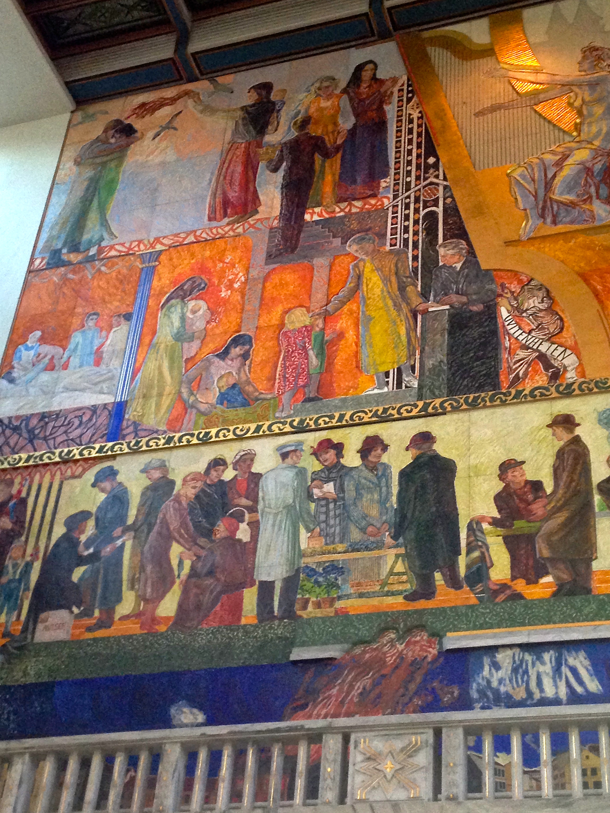 On the left side, at the very bottom below the figures, we see flames destroying Vika, the slum that was razed to make room for City Hall. The fiery scene not only calls to mind the many blazes that once plagued the wooded-shantied ghetto, but also refer to the social revolution avoided by creating better living conditions for its residents. The line of folks above the fire are all responsibly participating in local government and laboring to rebuild the city. Above them, we see healthcare being provided to mothers in Oslo’s new Maternity Ward, and children receiving free education in public schools.