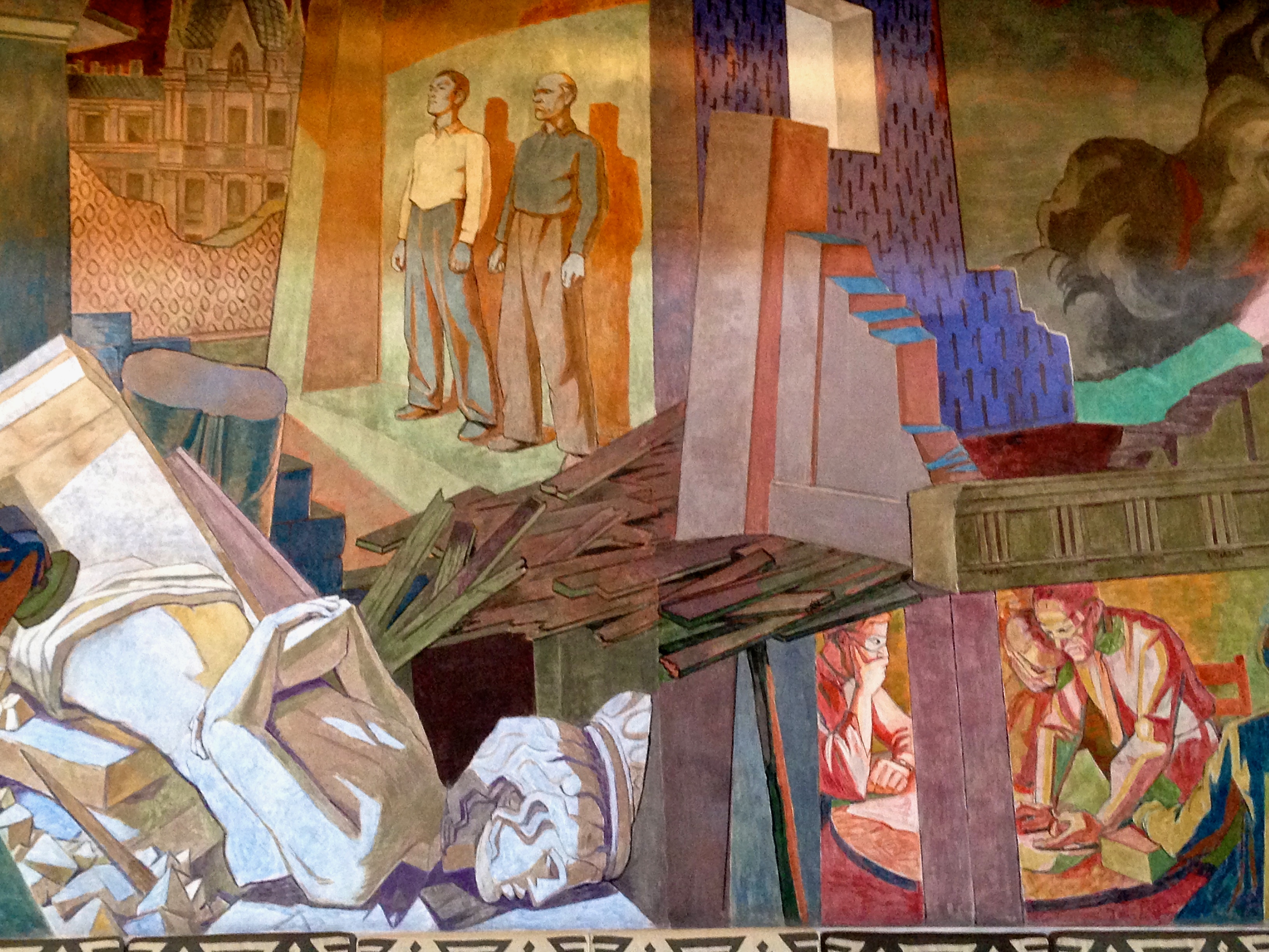 IMG_3032 October 6, 2015 3264 × 2448 Oslo City Hall Two resistance fighters are lined up against the wall and executed. Others continue to plot in the basement below, but wear masks and use nicknames so that they can’t reveal the identities of their compatriots if captured and tortured.
