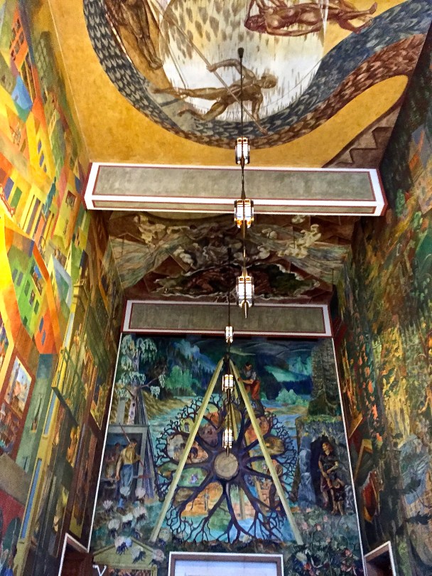 It took Per Krogh about ten years to complete the walls and ceiling of the East Gallery. He wanted visitors to feel that they were “in the middle of the picture, a part of its teeming life.” The tree-root imagery is intended to resemble the stained-glass rose windows found in cathedrals.