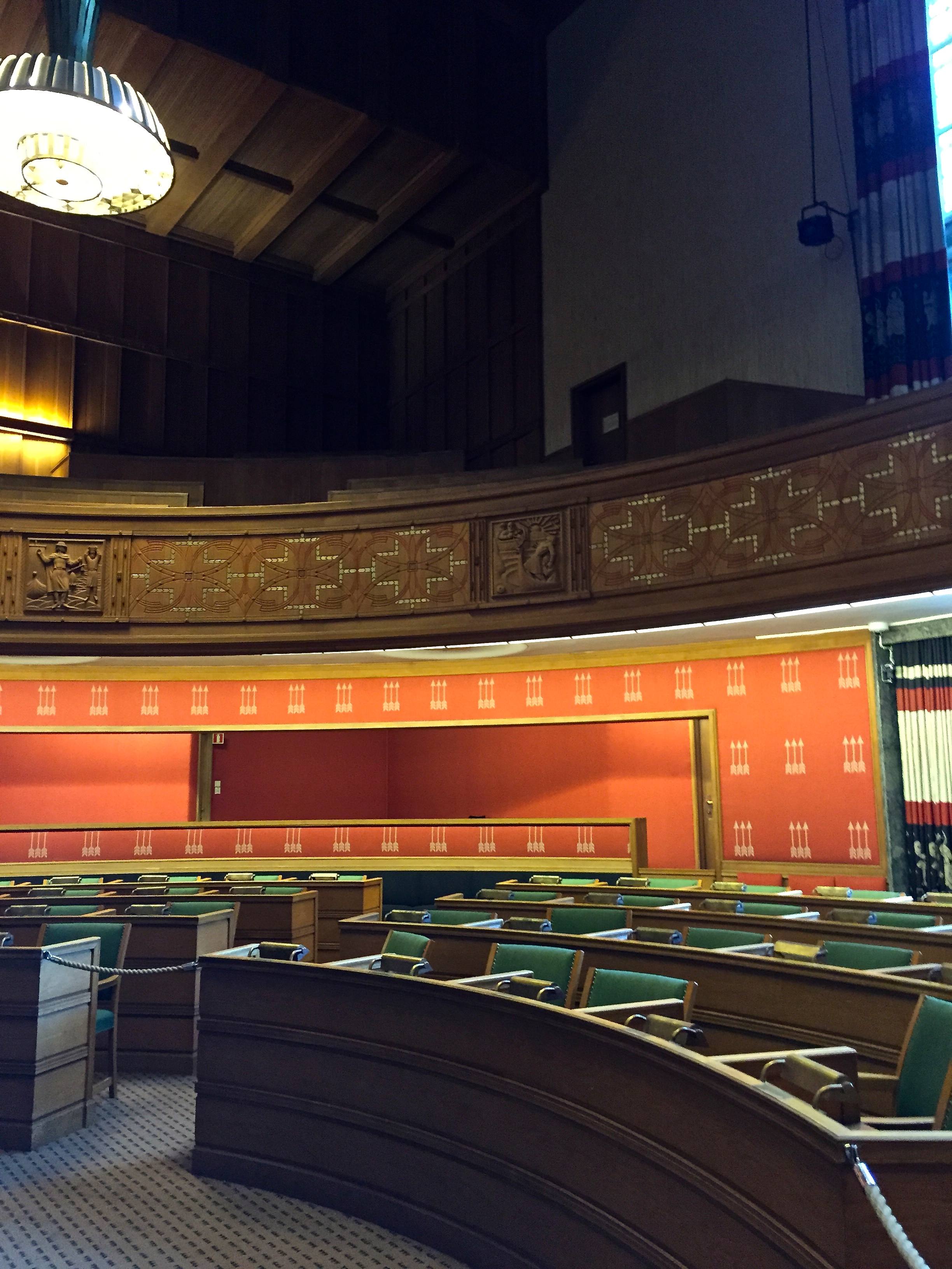 IMG_3998 October 6, 2015 2448 × 3264 Oslo City Hall The Council Chamber wallpaper sports a repeating theme of the three arrows that killed St. Hallvard — not exactly sure what kind of message this is intended to send to council members….