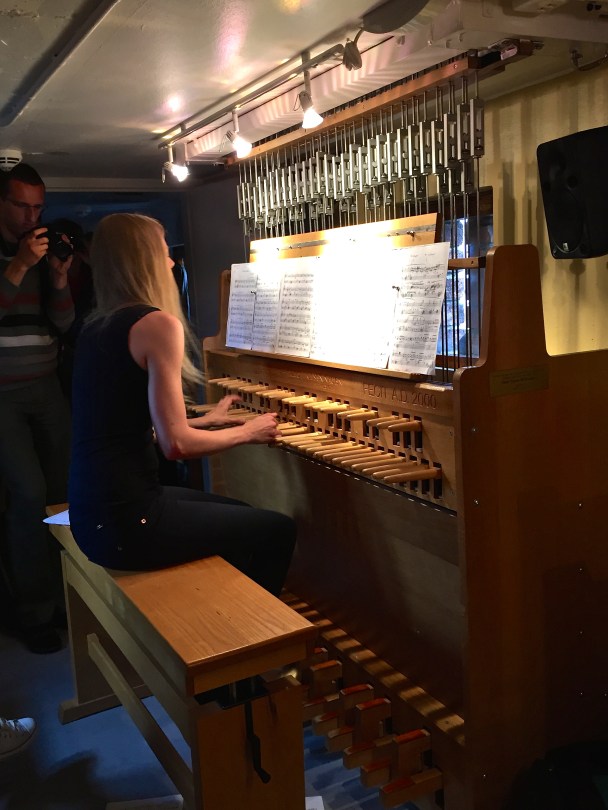 Below the copper tower, a brick room holds the organ-like device that the musician uses to ring the bells. We got quite a kick out of her 20-minute concert, performed by hammering on the levers with her fists and stamping on the pedals with her feet. She studied seven years to learn to play the instrument and gives a live performance every Sunday during summers. (The bells ring every hour, using tunes she programmed in previously — I guess there’s an automated setting?)