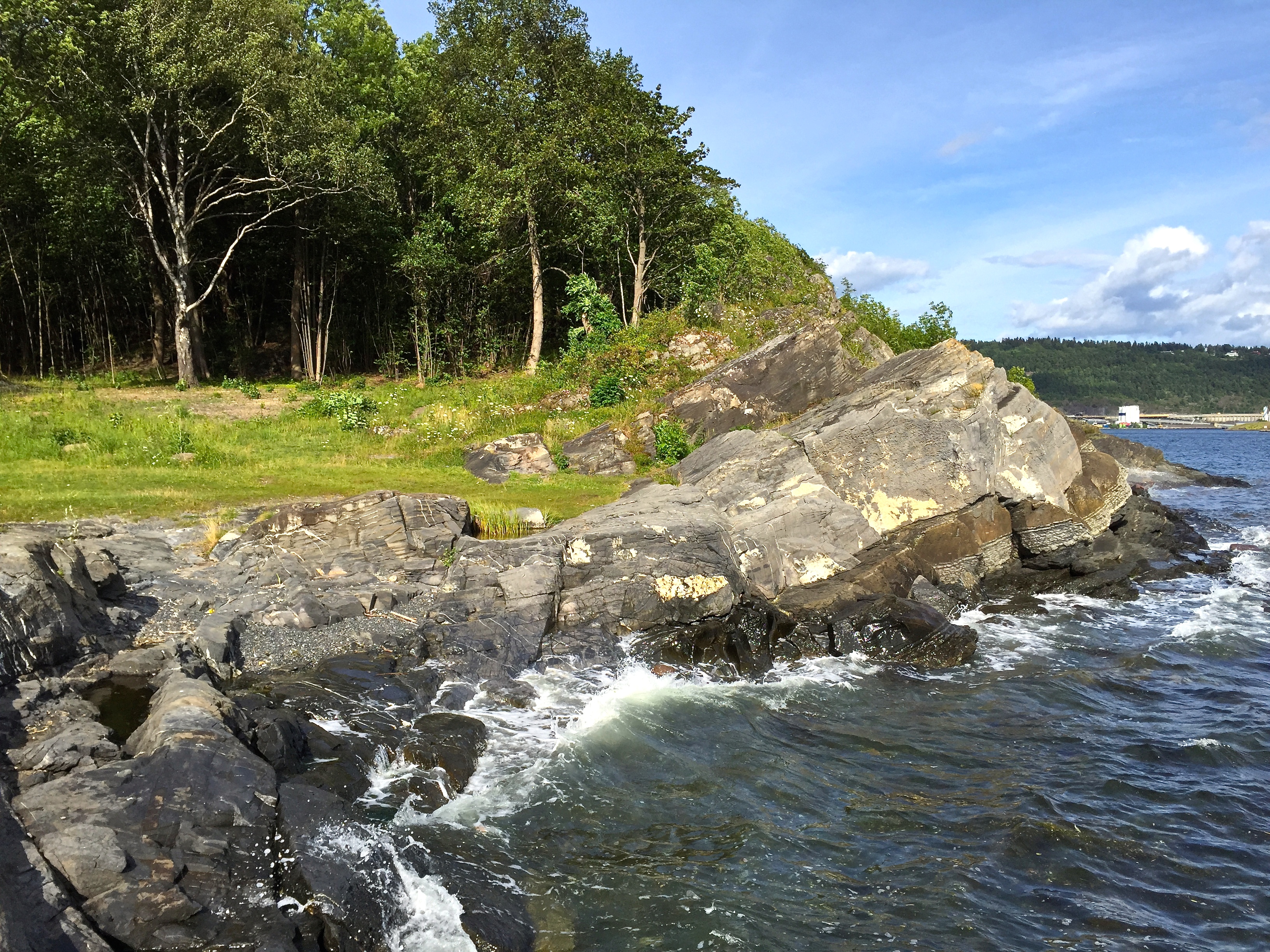 Hovedøya’s geology is both picturesque and unique for Norway, spanning a wide range of eras. Here you can see light-colored limestone from the Ordovician period (beginning 488.3 million years ago), when Earth experienced an extinction of 60% of its marine species. The darker mudstone dates from the following Silurian period, when life began to appear on land.