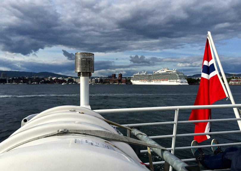 IMG_3952 October 9, 2015 3239 × 2295 Oslo’s Islands Umm … excuse me Mr. Mayor; I believe somebody may have parked a city in the middle of your harbor — check out the size of that cruise ship compared to City Hall, the reddish building with two towers to the left of the boat.