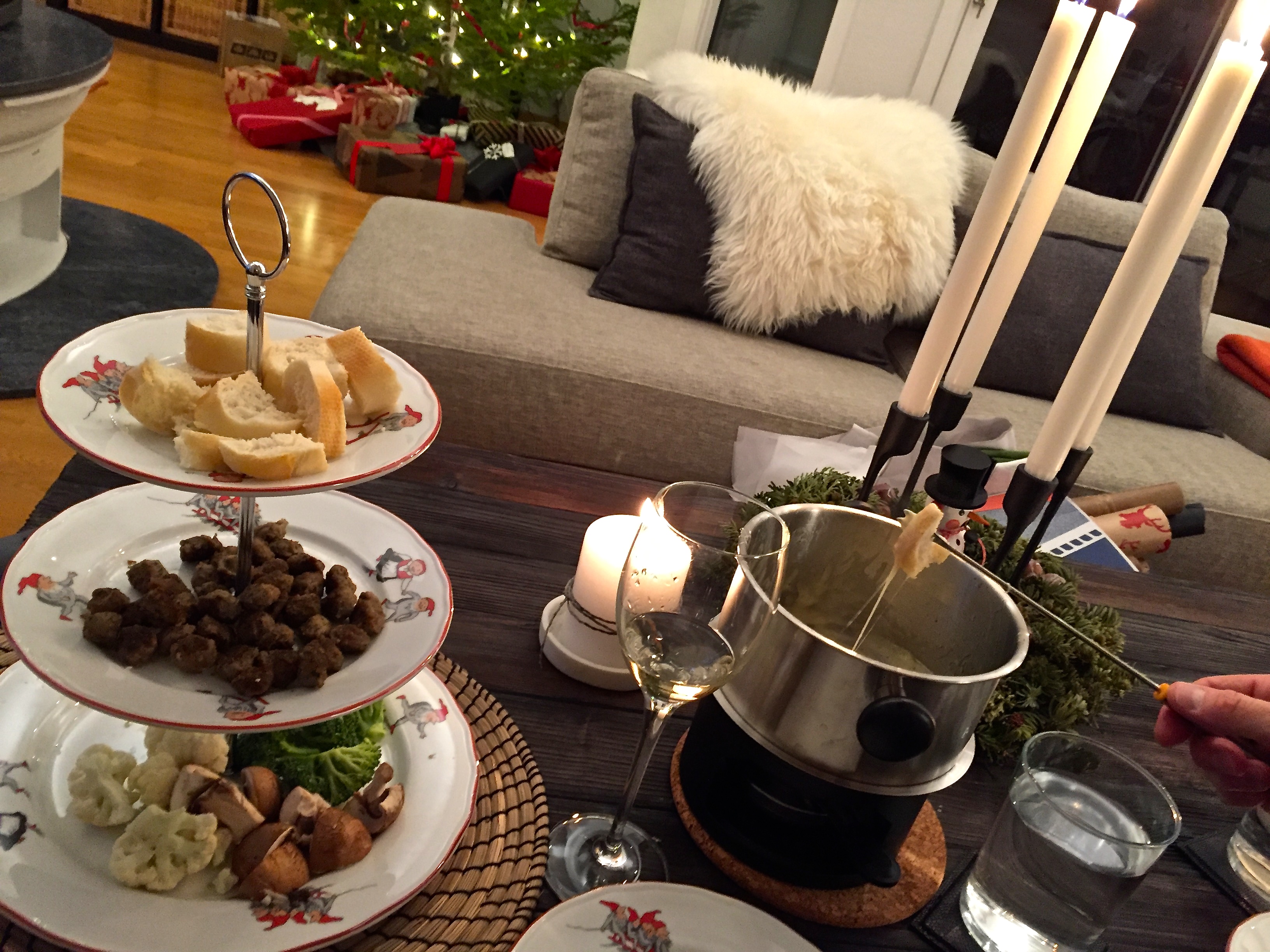 In any case, Christmas Eve eventually dawned bright and shiny, with no promise of snow. But despite this, folks seem jauntier now that The Big Day had finally arrived. (All the fun happens on Christmas Eve in Norway. Christmas Day is generally spent recovering from the previous evening’s festivities, and maybe indulging in a casual family supper.) To prepare for our own evening meal, Matthew and I ran around like crazed weasels as we finished grocery shopping before the stores closed at 1:00 p.m. Thankfully, we found all the ingredients to make our usual X-mas Eve dinner of Swiss fondue, which was followed by our annual viewing of The Thin Man.