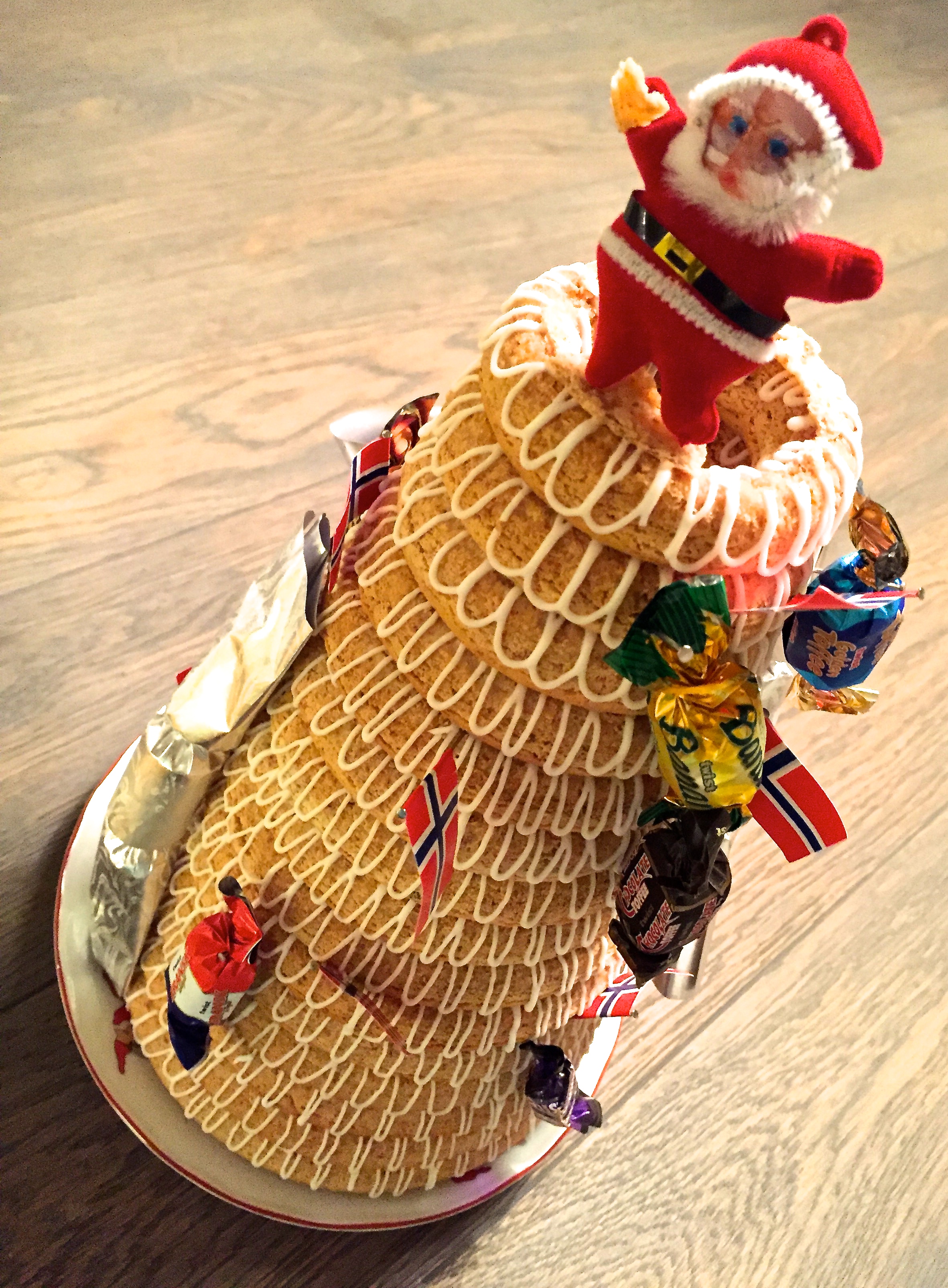 IMG_8321 January 26, 2016 2363 × 3212 A Quiet Christmas The Kransekake is decorated with candy and British-style crackers that pop open with a bang to reveal trinkets and jokes (in Norwegian) inside.