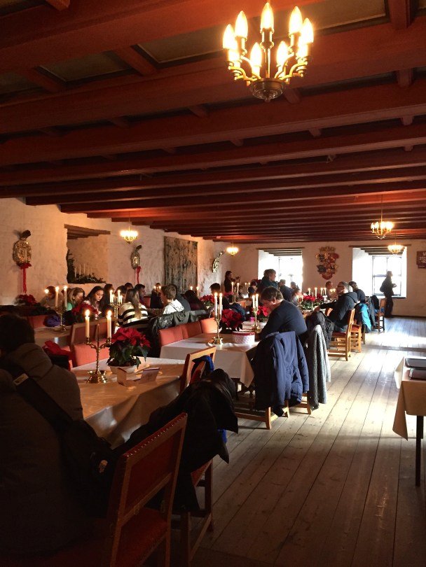 IMG_7348 January 18, 2016 2448 × 3264 Christmas at the Castle Another historic hall, transformed into a visitor dining hall complete with brass candelabra and lit candles — no fear of fire here.