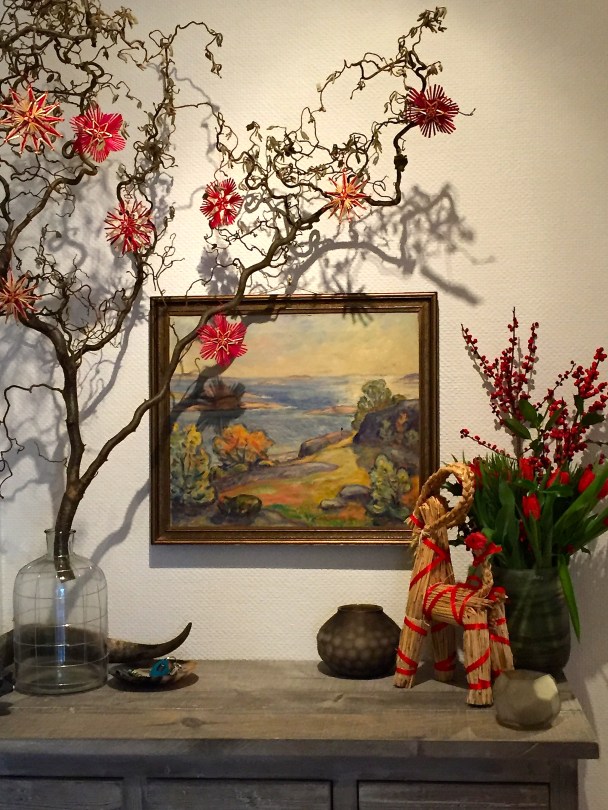 Our Trollhassel tree and Julebukk (Christmas goat.) Oddly enough, although reindeer are a fairly staple source of food and fur in Norway, and herds of reindeer can be a common site in areas up north, they’re not alway seen at the head of the Julenisse’s sleigh. Often, a big ram or goat (the Julebukk, think Yule Buck) does the job. As the story goes, two rams by the name of Tanngrisner and Tanngnjost graduated from pulling Thor’s cart across the sky to pulling the Julenisse’s sleigh for Christians.