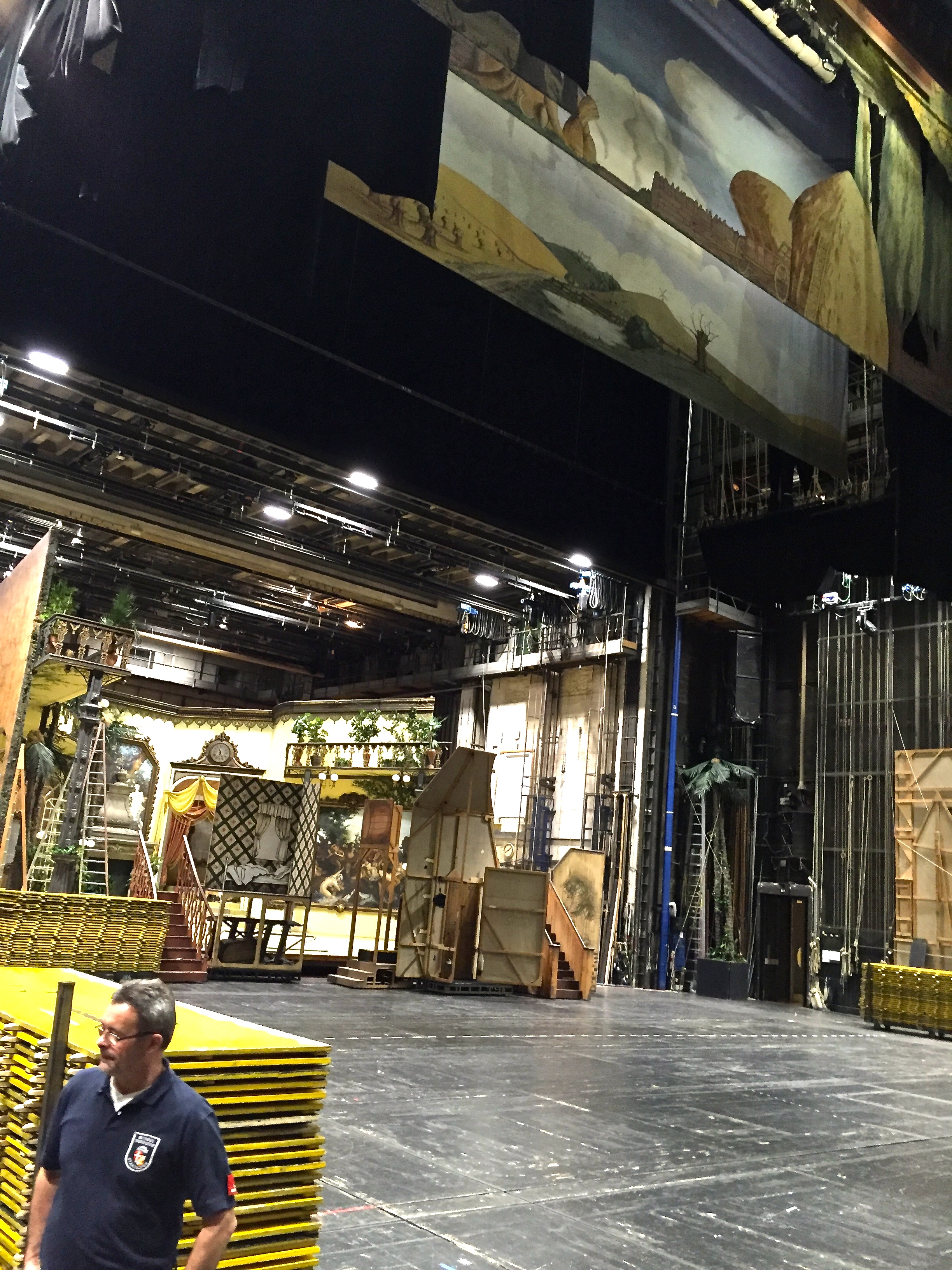 The tour backstage revealed the enormous resources it takes to put on an Opera. Stagehands work around the clock to set up and break down scenery, since different operas are performed each night to allow the singers to rest their voices. Enormous warehouses around town house stage sets brought to and fro by trucks each day. The stage floor is pockmarked with trap doors through which parts of the set are raised and lowered via elevators that access a many-leveled basement.
