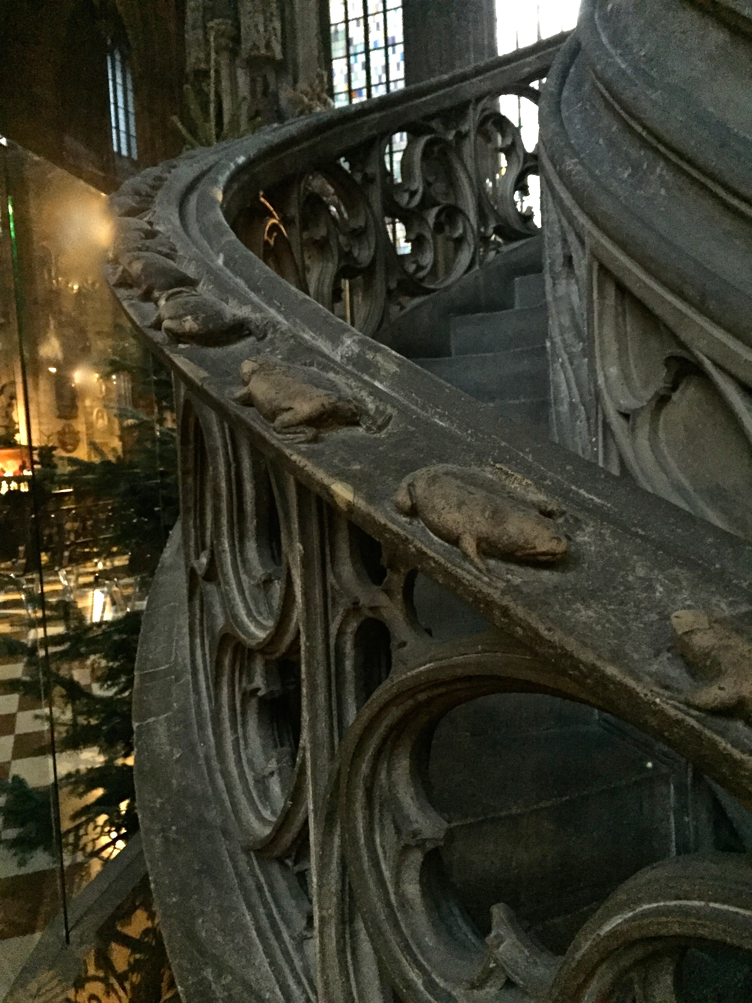 Along the pulpit’s carved railing, lizards of light (good) wage war against frogs of darkness (evil). The three-lobed curlicues rolling up the stairs beneath the frogs symbolize the Trinity, while the four-spoked curlicues rolling down symbolize the four seasons and four cardinal directions. (Look at the top of the stairs to see the two next to one another.)