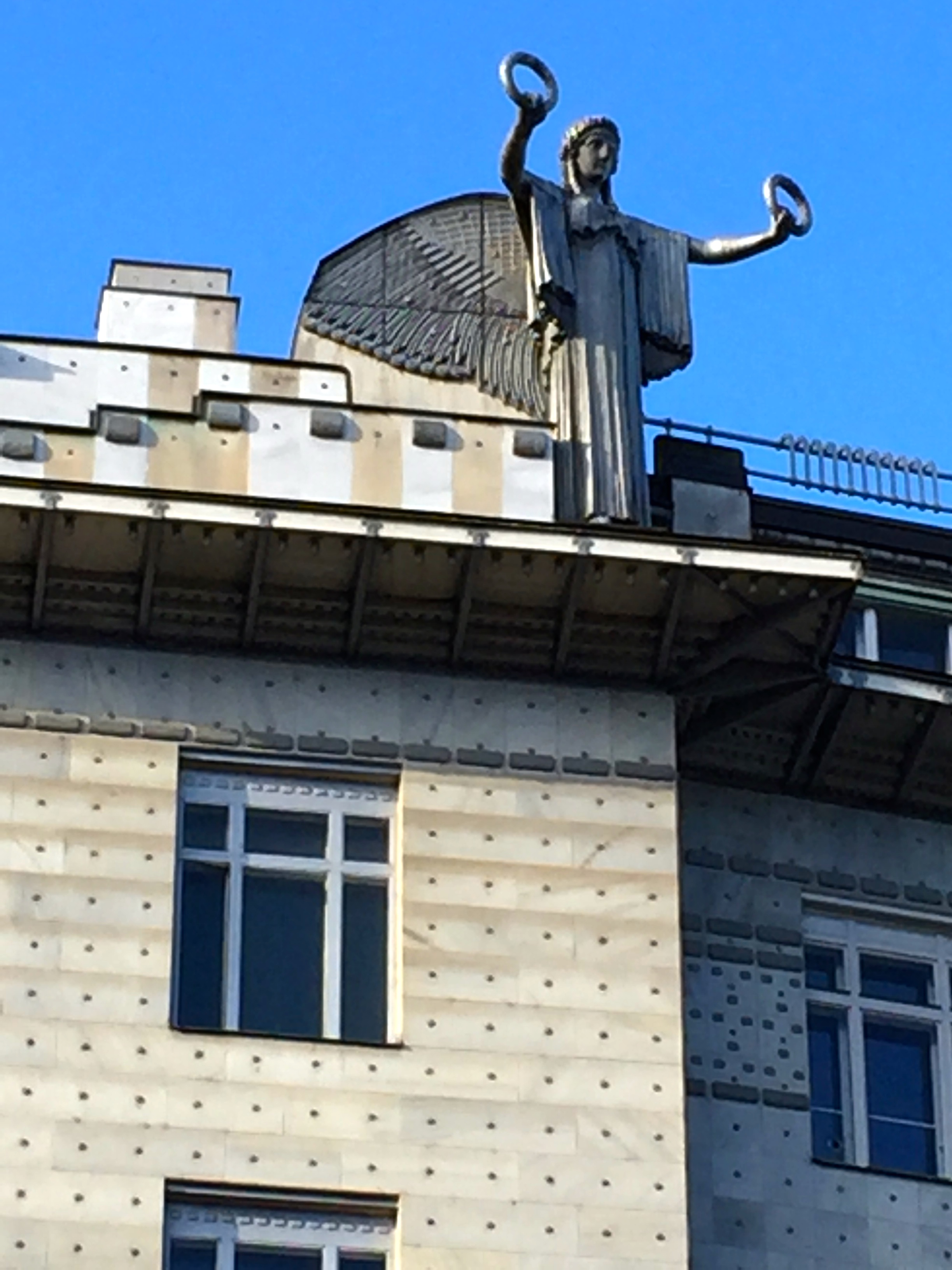 Marble plates adhered with aluminum-capped iron rivets coat the building, making it easy to maintain and clean — a Modernist goal. Modernity scorns unnecessary ornamentation, considering it a waste of the workers’ time and energy. But Wagner apparently relented enough to let his buddy, secessionist sculptor Othmar Schimkowitz, create some classical winged victories for the rooftop. I wonder if modernists ever realized that their anti-ornamentation and low-maintenance stance eventually put workers and artists out of jobs?