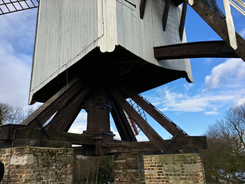 IMG_9550 April 11, 2016 4032 × 3024 Belgium: Biking to Damme A closeup shows the post that the building pivots around. Can you imagine how much effort it took to crank this baby into the wind?