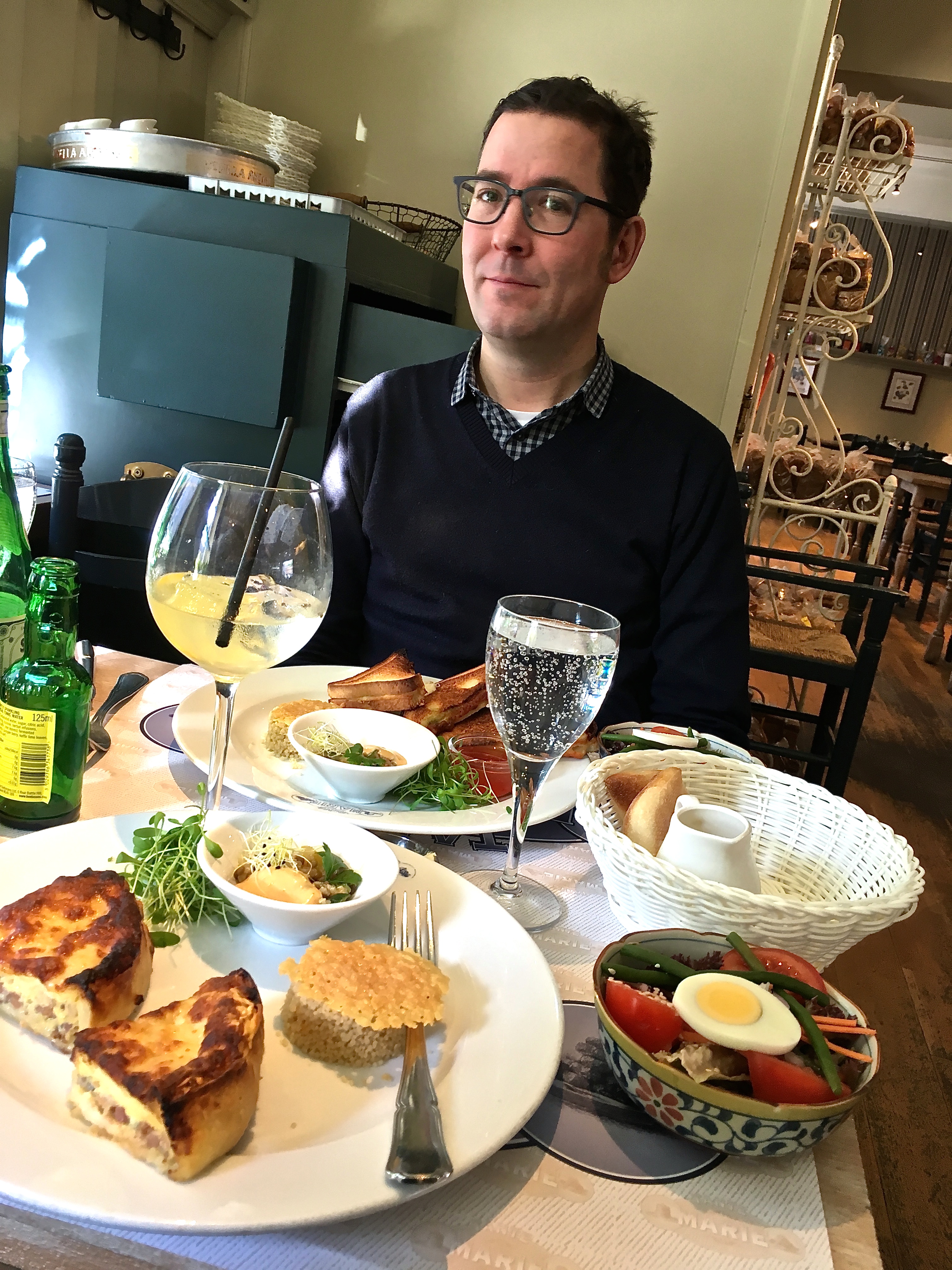 IMG_9620 April 11, 2016 3024 × 4032 Belgium: Biking to Damme Our delicious meal at Tante Marie’s. Matthew looks none too pleased about pausing for photos — he was plumb tuckered out from the ride and in need of fuel.