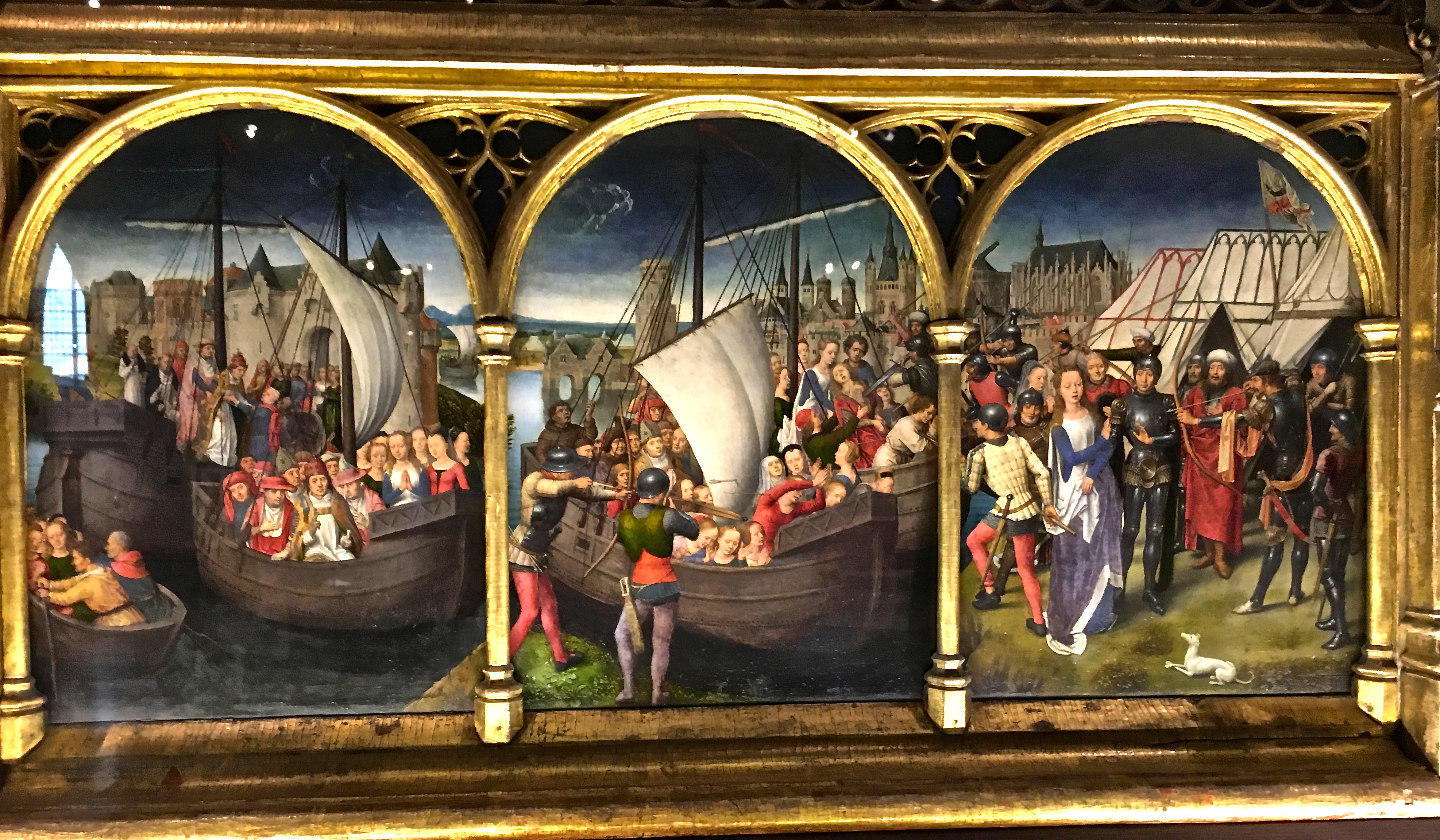 The first arch on this side of the shrine shows St. Ursula — accompanied by the Pope and her 11,000 virgins (reduced to 11 here to save on space) — on board a ship. In the second arch, they arrive in Koln to find that the Huns have taken over the city. The Huns stab Ursula’s betrothed, who dies in her arms. And in the third arch, when she won’t marry the bearded Hun king, an archer shoots her dead. Memling painted himself and his wife, Anna, into this last scene. (He’s the guy in red looking over Ursula’s left shoulder, and Anna’s the lady wearing a netted white cap and peering over Ursula’s right shoulder.)