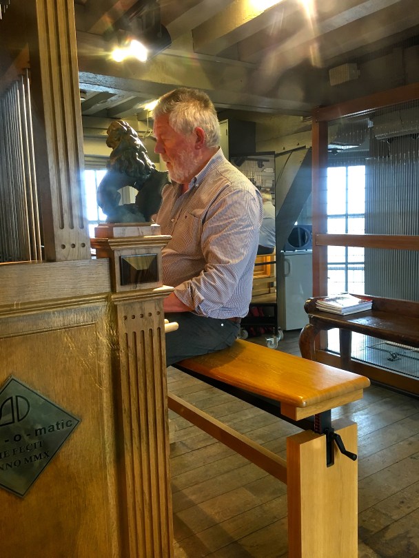 You can see just the ends of the little wooden levers that stick out of the carillon. The man strikes these with the edge of his fists, which he uses like hammers. His feet get in on the action, too, by stamping out some of the deeper notes on pedals.
