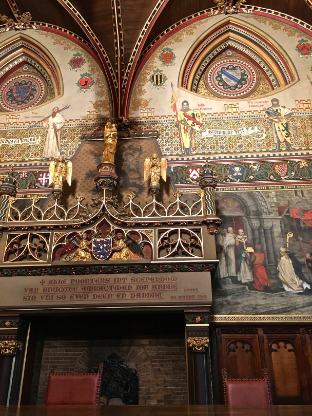 IMG_9396 April 7, 2016 3024 × 4032 Belgium: “In Bruges” The fabulous fireplace touts the 13th-century proclamation that “All the artisans, laborers, and citizens of Bruges are free.” Pretty emancipated thinking for the time.