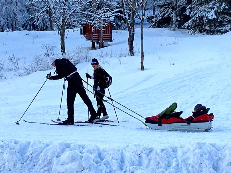 IMG_9769 April 28, 2016 4032 × 3024 Skiing to Ullevålseter A family of four out for a little exercise … at least for the parents. The kids recline in their cushy sled.