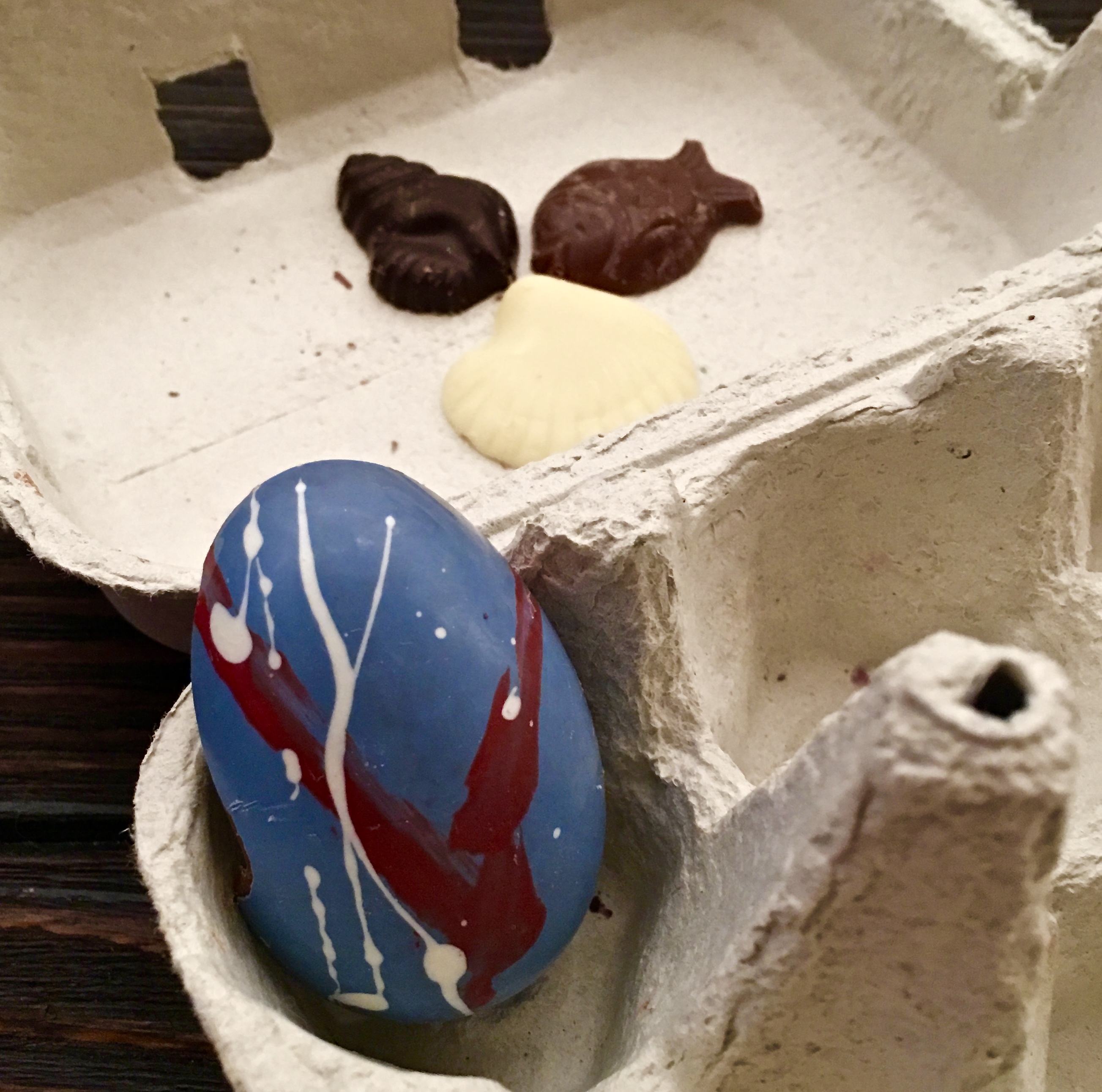 I bought a carton of hollow-chocolate Easter eggs. Inside each lay three milk, white, and dark chocolates in the shape of fish, shells, etc. The marine theme is due to the holdover Catholic tradition of a meatless Good Friday focused on seafood (even though Norwegians are now Lutheran by birth — truly, you’re born into the Lutheran church and have to opt out later.)