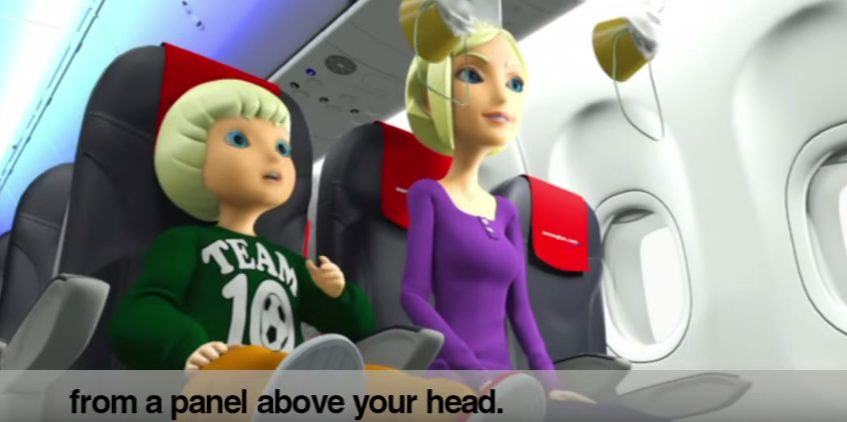 But my favorite moment comes when the video illustrates what to do during an emergency situation. As the father assumes the position, the narrators says: “Upon the command ‘brace for impact,’ bend over and grab your ankles.”