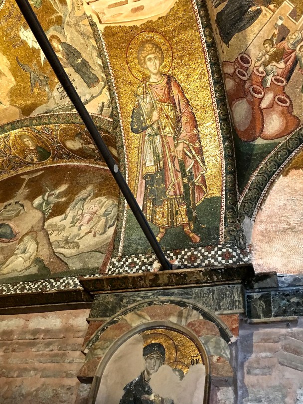 Pictured is a stunning mosaic of St. Demetrius. To his left are scenes from the birth of Jesus. Most of the mosaics date to the 12th century and were made by drawing rough pictures on plaster, then embedding them with colored and gilded square tiles of ceramic, glass, bricks, and stone.