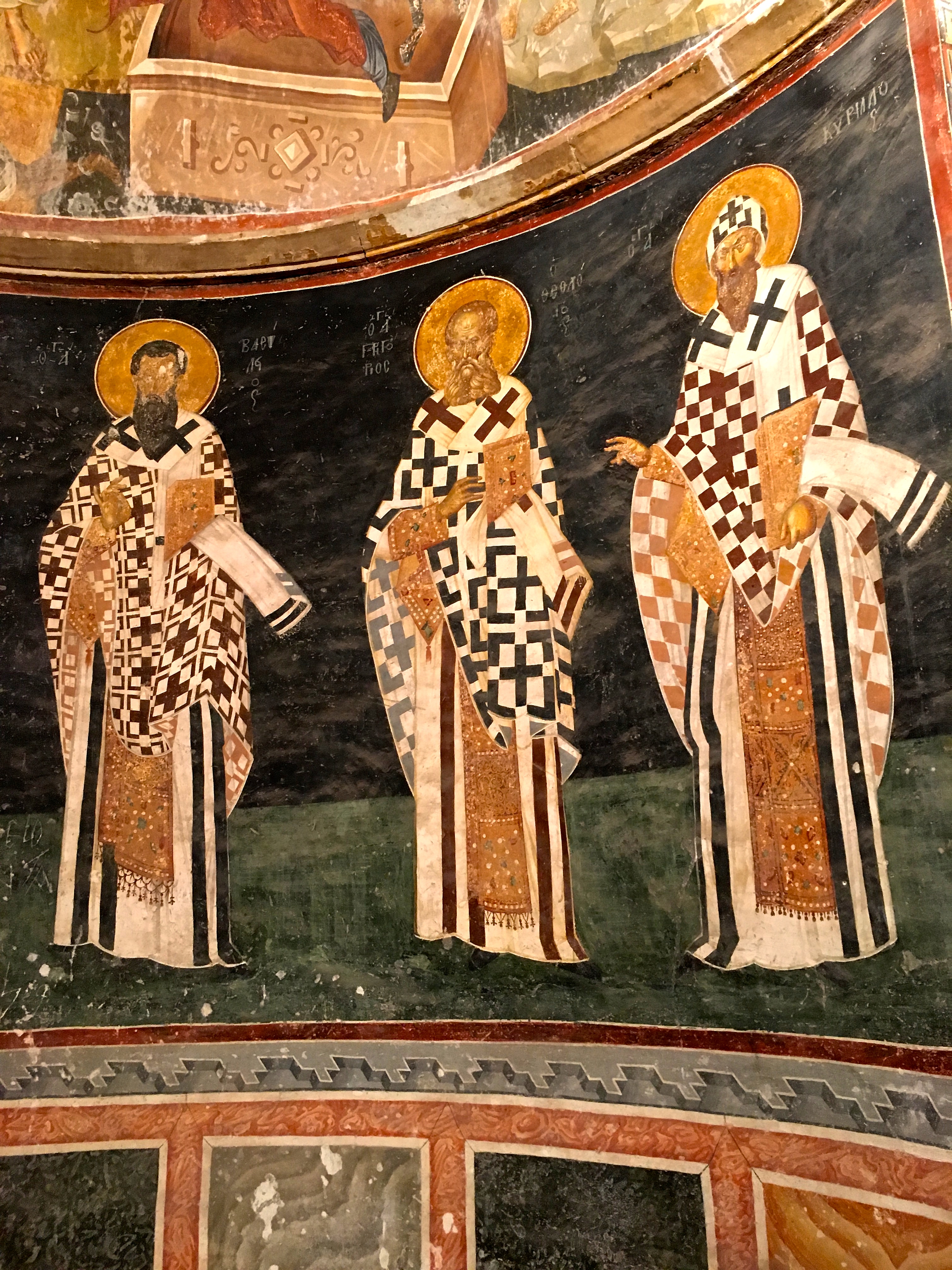 IMG_0215 June 28, 2016 3024 × 4032 Turkey: Mosques & Museums Pictured are the Orthodox Church fathers, St. Basil, St. Gregory, and St. Cyril. These figures look incredibly modern to me, almost like murals by Charles Rennie Mackintosh and his wife Margaret McDonald.