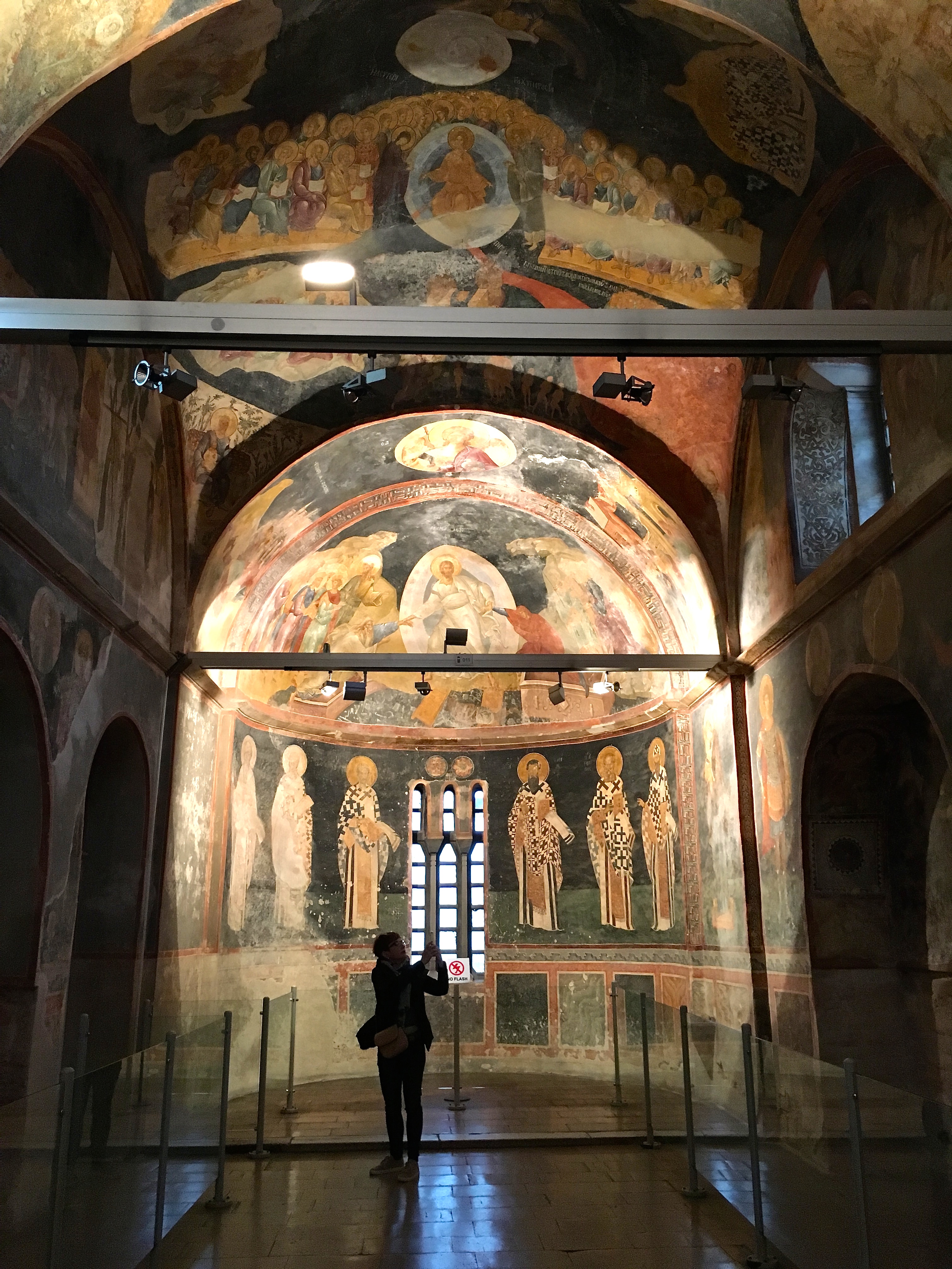 In addition to the church mosaics, a side mortuary chapel (the Parakklesion) has some unbelievable frescoes. It was dedicated to Theodore Metochites, who refurbished the Chora Monastery / Church in the 11th century and put in all the murals. The guy has a pretty fascinating history. He started off life in exile because his parents had tried to reunite the Eastern Orthodox and Roman Catholic faiths. He worked his way back into favor by arranging marriages for the Emperor and his cronies. Over time, he became treasurer, and later prime minister. But when a fight broke out between rivals for the throne, Metochites backed the wrong guy and was exiled once again. Eventually, he was allowed to return and became a monk in his own monastery.