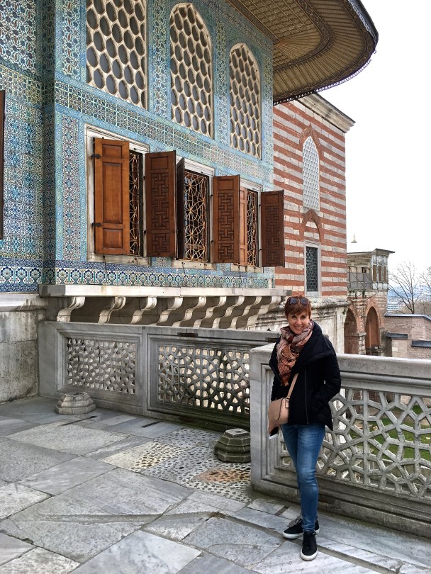 IMG_0293 June 28, 2016 3024 × 4032 Turkey: Mosques & Museums The Fourth Courtyard of the palace is a quiet place that looks out over the Golden Horn and the Bosphorus. The Sultan’s Chamber is behind me.