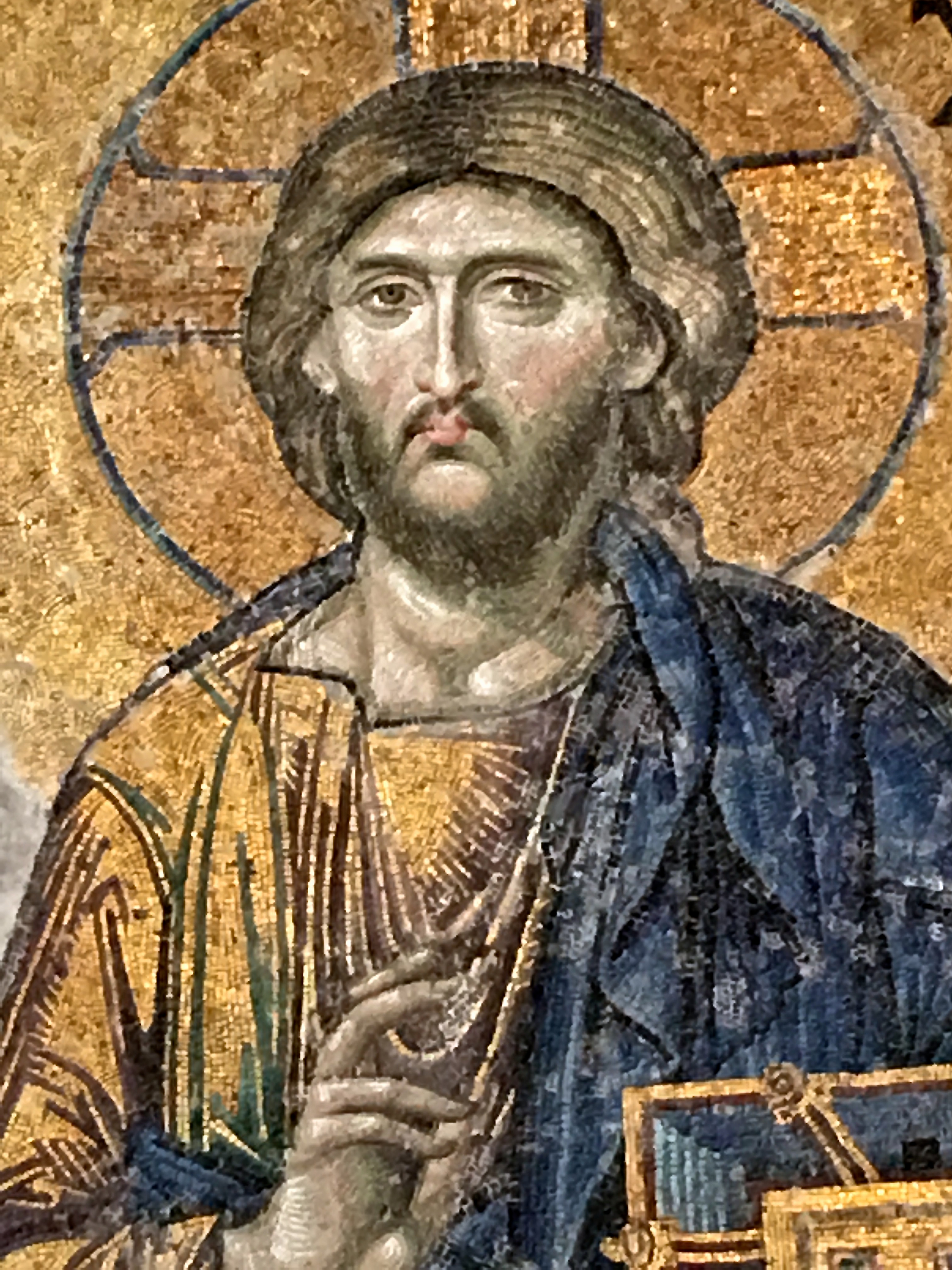 This mosaic has a Deësis theme. (The word means “entreaty” in Greek.) It shows Mary and John the Baptist pleading with Jesus for the forgiveness of sinners. I’m showing only Christ in the photo so you can see close up how incredible the mosaic work is. It dates to the 13th or 14th century and is considered the finest mosaic in Hagia Sophia. The only reason figurative mosaics like this survived the age of Iconoclasts and Islam is because they were plastered and painted over, and later rediscovered during restorations.