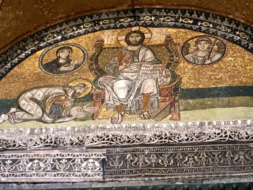 The mural above the Imperial Gate shows Christ with Emperor Leo VI, known as “Leo the Wise.” After three wives died without giving him children, he married his mistress because she’d born him a son. The patriarch of the Orthodox Church excommunicated him for this scandal, so he seen here begging Christ for forgiveness. Murals like this survived only because they were fortunately painted over rather than removed.