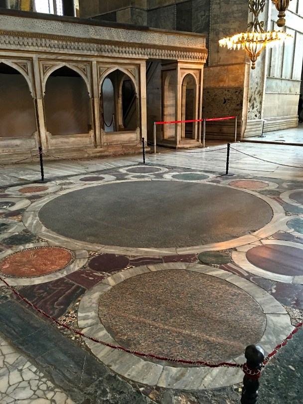 IMG_0974 June 24, 2016 3024 × 4032 Turkey: Mosques & Museums Called the Omphalion, the green marble circle in the middle marks the spot where the Emperor would sit during church services. The coronation of every Byzantine Emperor was held on this big dot.