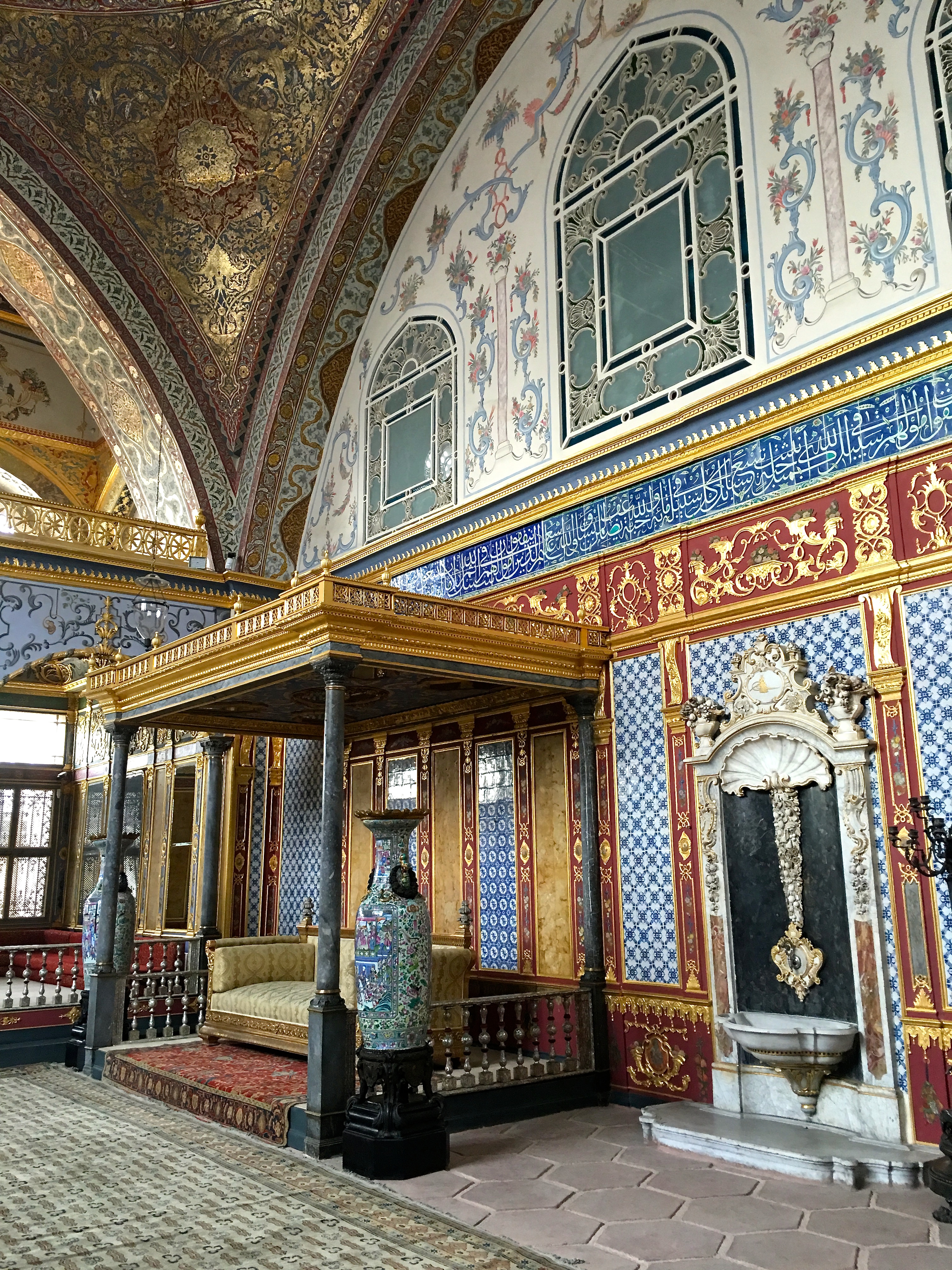 IMG_1456 June 28, 2016 3024 × 4032 Turkey: Mosques & Museums The Imperial Hall — a reception space — is the largest room in the sultan’s private apartments. Around the room run verses from the Quran. What looks like a canopied bed is actually the sultan’s throne.