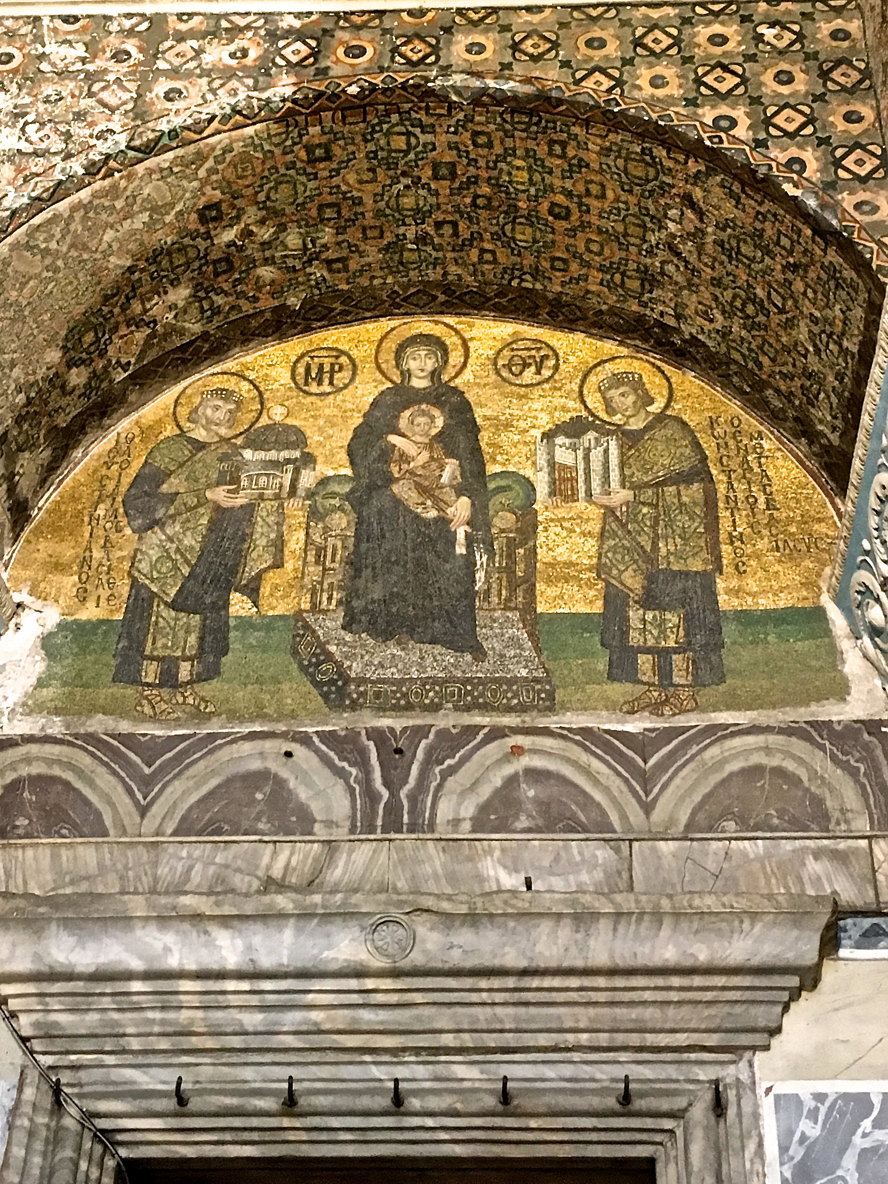 The mural above the Vestibule door dates back to the 11th century and shows Mary and Jesus being presented with gifts from two important Byzantine Emperors. Constantine (right) offers the city of Istanbul, and Justinian (left) serves up Hagia Sophia itself, his greatest claim to fame.