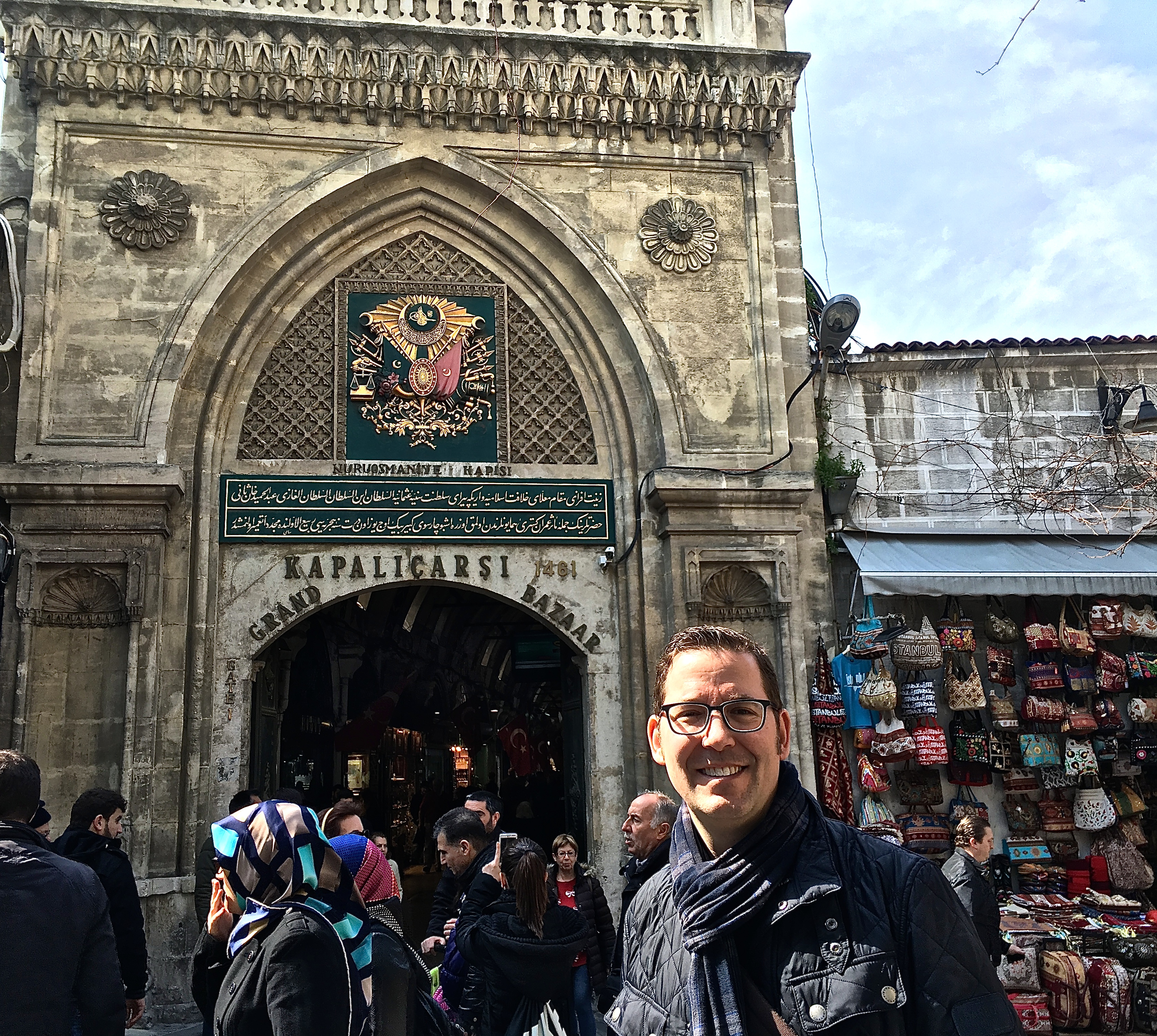 IMG_1189 June 30, 2016 3373 × 3020 Turkey: The Grand Bazaar The main entrance into the bazaar sports the Ottoman coat of arms above the door — a green flag for the Islamic caliph and a red one for the Ottoman dynasty. Armed guards with metal detectors await beneath it to check your bag and scan your body.