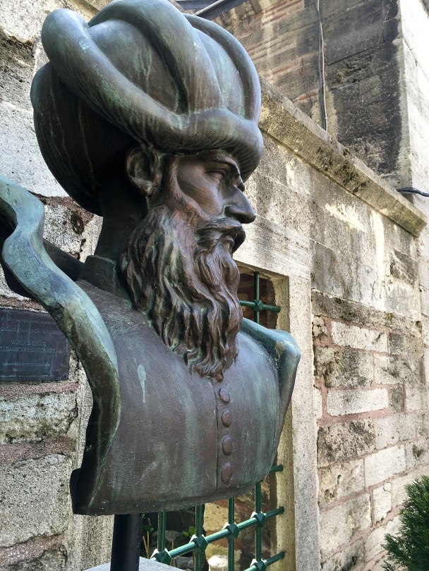 IMG_1322_2 June 30, 2016 3024 × 4032 Turkey: The Grand Bazaar A statue of architect Mimar Sinan sits in the courtyard. He designed the Medresesi for Caferaga, a eunuch under Sultan Süleyman the Magnificent.