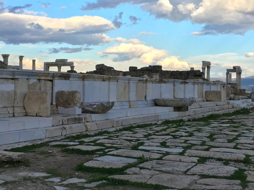 IMG_0568 July 6, 2016 4032 × 3024 Turkey: Pamukkale, Hieropolis, & Laodicea The Nymphaeum of Emperor Septimius Severus stood in the middle of a U-shaped, two-story colonnade. Three fountains fed the main pool, and outlets trickled into three bowls that sat almost at street level. (Two bowls can be seen here.)