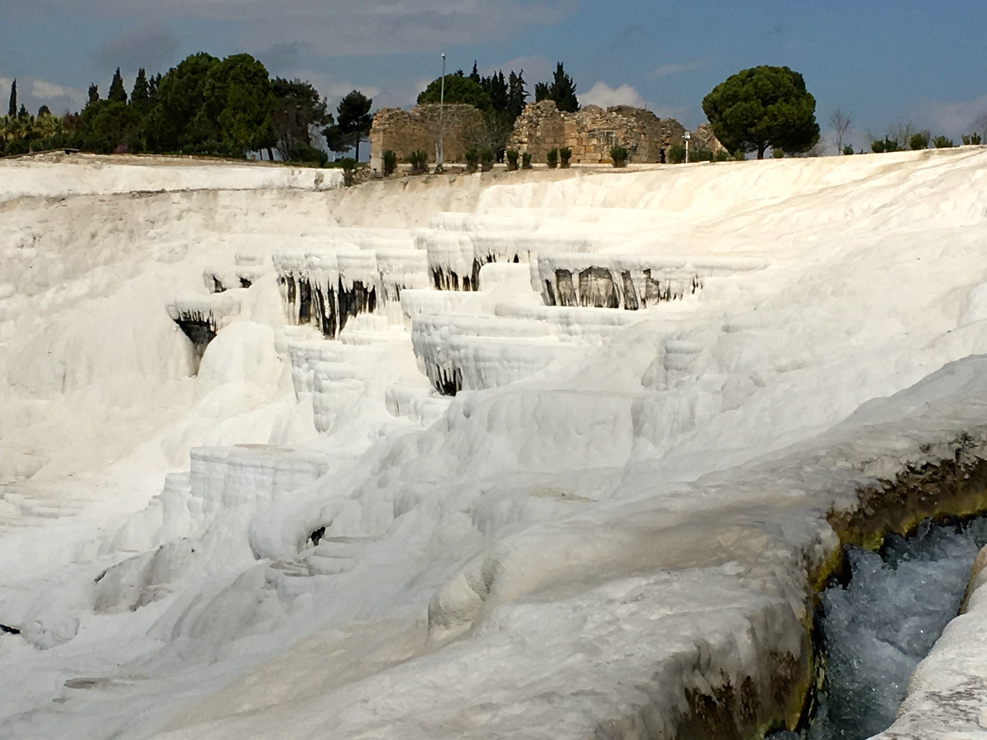 Geothermal pools are telltale signs of underground volcanic activity. Many earthquakes have hit Hieropolis over the years; the last one leaving it in ruins in 1354 A.D. In this photo, some of the city’s remains can be seen above the travertine terraces.