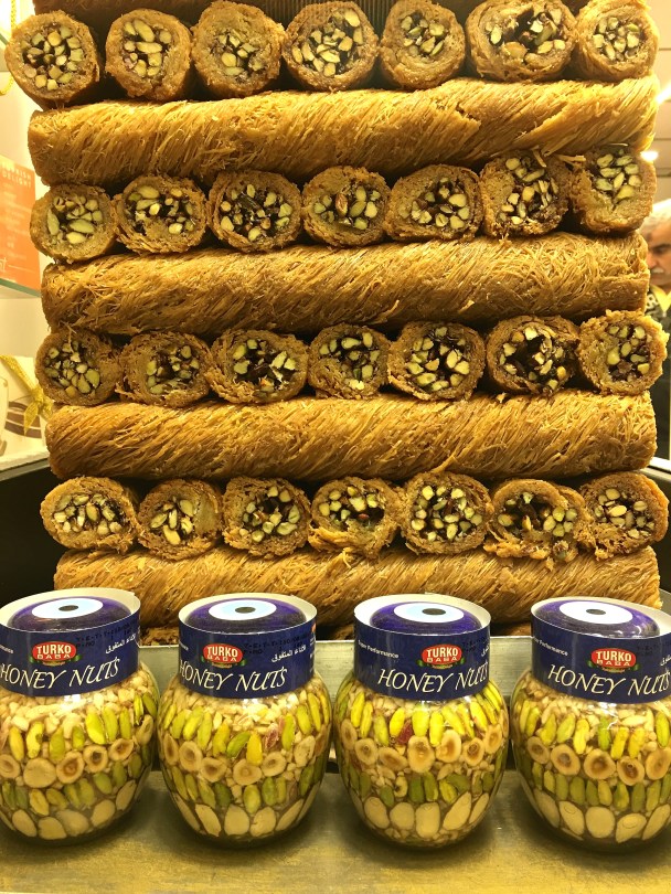 IMG_1149_2 July 18, 2016 3024 × 4032 Turkey: Essential Istanbul Experiences Nuts preserved in jars of honey compete with a tower of “kadayif,” a dessert made of shredded wheat, nuts, and syrup.