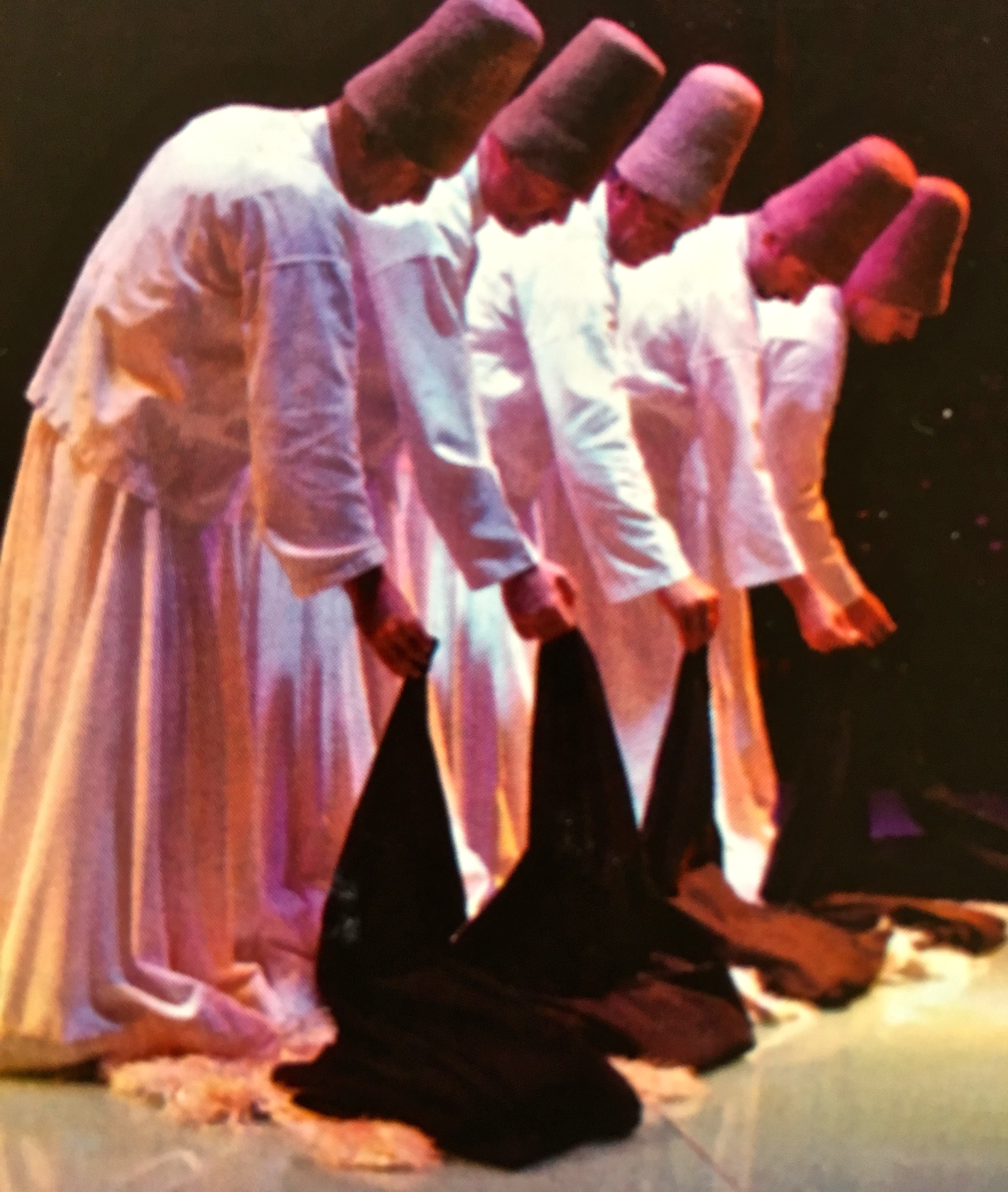 As part of the cycle involving the “birth of humankind,” the Dervishes remove their emblems of death and begin to rotate on their own axis, spinning only on their left foot. They also revolve around the sheikh in the center of the circle. The circular pattern mimics the orbit of the planets around the sun; the motion of electrons, neutrons, and protons around the nucleus of the atom; and the circulation of blood cells back to the heart. Photo from Hodjapasha brochure.
