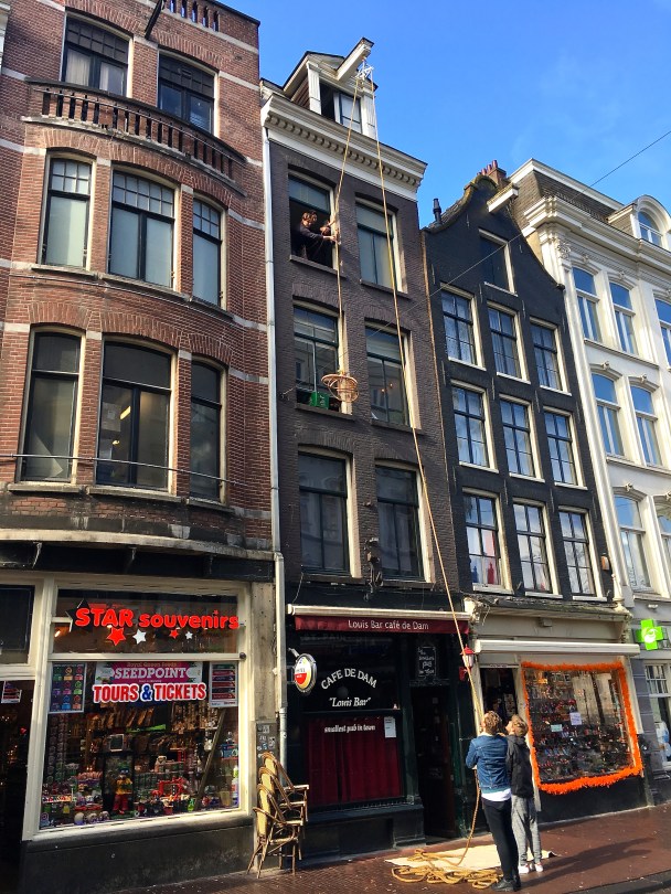 Check it out — we watched some folks employing the pulley system to move their furniture into an upper-level apartment. Although why it takes three guys to lift a rattan chair is beyond me. And why they couldn’t bring the tiny thing in through the hallway is also a mystery.