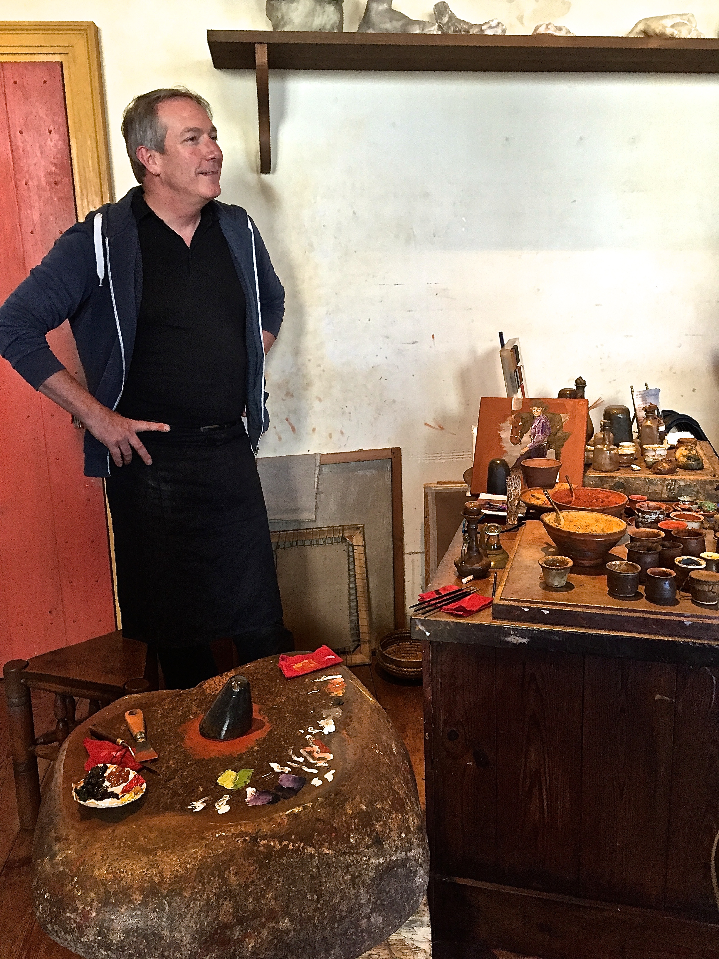 A docent artist ground up minerals, added linseed oil, and let us mix them up to create ochre paint according to Rembrandt’s formula. I was astonished at how much the paint adhered the pestle to the mortar — it took some serious elbow grease to blend the mixture.
